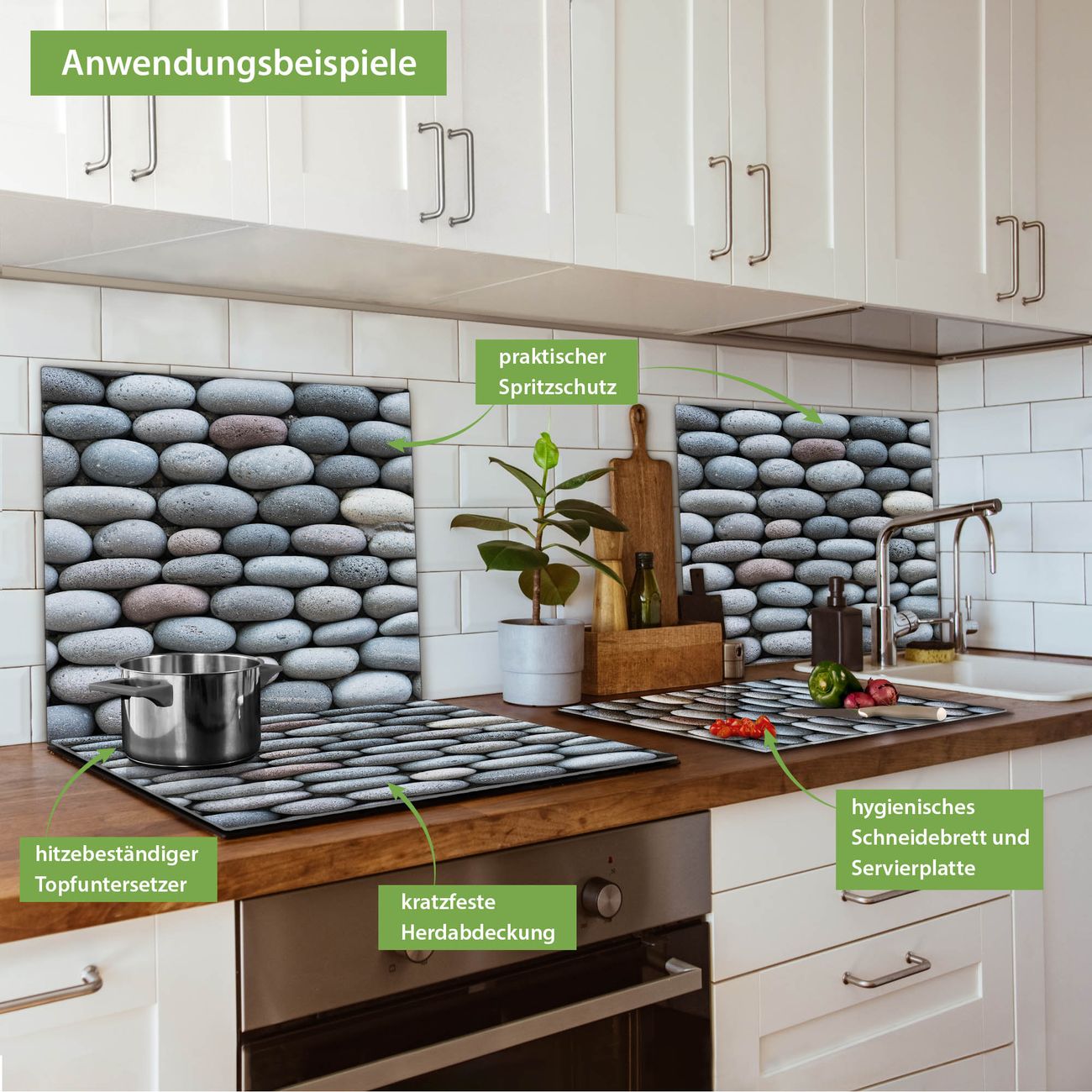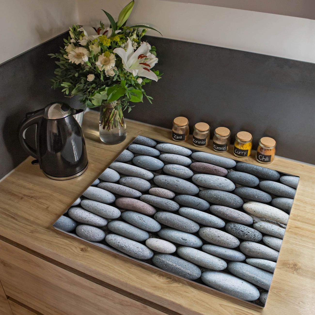 VIELSEITIG: Die Ceranfeldabdeckung ist vielseitig einsetzbar: ob als Spritzschutz hinter dem Herd für Ihre Küche oder als Glas Schneidebrett als hygienische und geruchsneutrale Unterlage. Sie können ebenfalls heiße Töpfe und Pfannen bis 100°C auf der Herdplattenabdeckung abstellen. Sie erhalten ein Multitalent für Ihre Küche. Die banjado Herdabdeckplatte aus Glas mit Motiv Runde Steine verdeckt mit einem schönen Motiv Ihr Ceranfeld bzw. Ihren Induktionsherd. Die Herdabdeckplatte ist vielseitig einsetzbar und passt sich dabei Ihrem Einrichtungsstil an. DESIGN: Die Herdabdeckung Runde Steine besteht aus hochwertigem, gehärtetem Glas mit einem unserer zahlreichen Motive. Sie haben die Wahl zwischen verschiedenen Maßen von einteiligen, zweiteiligen und einer dreiteiligen Herdabdeckung. Wählen Sie was zu Ihrer Einrichtung passt! DETAILS: Die Herdabdeckplatte ist vielseitig einsetzbar. Die Ecken sind für mehr Sicherheit dezent abgerundet, das Glas ist gehärtet. Sie erhalten separate Gummi Abstandshalter, damit Ihre Abdeckung rutschfest auf dem Herd steht. Diese können Sie frei positionieren, sodass die Herdabdeckung perfekt auf Ihrem Ceranfeld sitzt. BANJADO: Wir sind ein kleines Team aus dem Herzen von Sachsen und fertigen jeden Artikel nach Bestellung eigens für Sie an. Sie erhalten also keine preiswerte Importware, sondern Handarbeit. Auf Wunsch sind auch andere Farben und Größen möglich, kontakierten Sie uns gern.