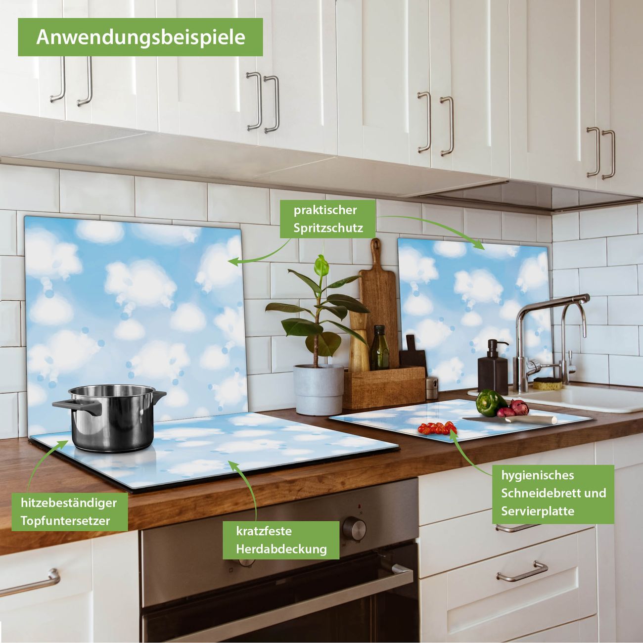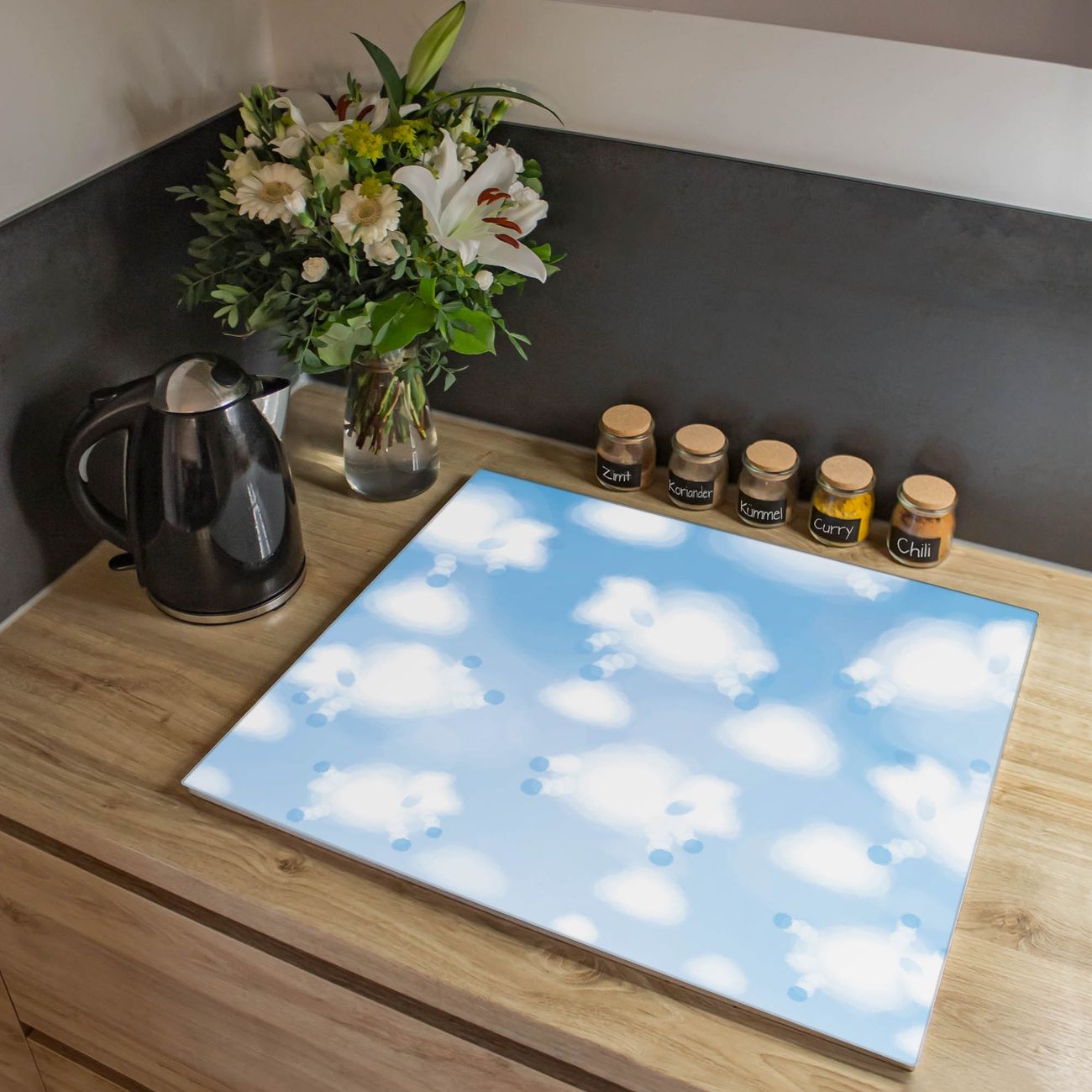 VIELSEITIG: Die Ceranfeldabdeckung ist vielseitig einsetzbar: ob als Spritzschutz hinter dem Herd für Ihre Küche oder als Glas Schneidebrett als hygienische und geruchsneutrale Unterlage. Sie können ebenfalls heiße Töpfe und Pfannen bis 100°C auf der Herdplattenabdeckung abstellen. Sie erhalten ein Multitalent für Ihre Küche. Die banjado Herdabdeckplatte aus Glas mit Motiv Schäfchenwolken verdeckt mit einem schönen Motiv Ihr Ceranfeld bzw. Ihren Induktionsherd. Die Herdabdeckplatte ist vielseitig einsetzbar und passt sich dabei Ihrem Einrichtungsstil an. DESIGN: Die Herdabdeckung Schäfchenwolken besteht aus hochwertigem, gehärtetem Glas mit einem unserer zahlreichen Motive. Sie haben die Wahl zwischen verschiedenen Maßen von einteiligen, zweiteiligen und einer dreiteiligen Herdabdeckung. Wählen Sie was zu Ihrer Einrichtung passt! DETAILS: Die Herdabdeckplatte ist vielseitig einsetzbar. Die Ecken sind für mehr Sicherheit dezent abgerundet, das Glas ist gehärtet. Sie erhalten separate Gummi Abstandshalter, damit Ihre Abdeckung rutschfest auf dem Herd steht. Diese können Sie frei positionieren, sodass die Herdabdeckung perfekt auf Ihrem Ceranfeld sitzt. BANJADO: Wir sind ein kleines Team aus dem Herzen von Sachsen und fertigen jeden Artikel nach Bestellung eigens für Sie an. Sie erhalten also keine preiswerte Importware, sondern Handarbeit. Auf Wunsch sind auch andere Farben und Größen möglich, kontakierten Sie uns gern.