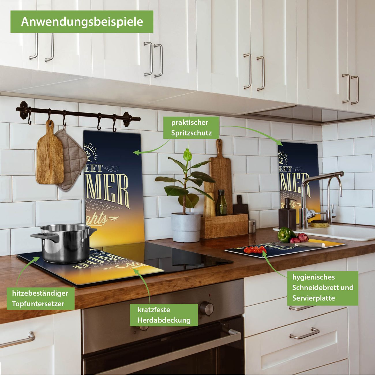 VIELSEITIG: Die Ceranfeldabdeckung ist vielseitig einsetzbar: ob als Spritzschutz hinter dem Herd für Ihre Küche oder als Glas Schneidebrett als hygienische und geruchsneutrale Unterlage. Sie können ebenfalls heiße Töpfe und Pfannen bis 100°C auf der Herdplattenabdeckung abstellen. Sie erhalten ein Multitalent für Ihre Küche. Die banjado Herdabdeckplatte aus Glas mit Motiv Sommer Night verdeckt mit einem schönen Motiv Ihr Ceranfeld bzw. Ihren Induktionsherd. Die Herdabdeckplatte ist vielseitig einsetzbar und passt sich dabei Ihrem Einrichtungsstil an. DESIGN: Die Herdabdeckung Sommer Night besteht aus hochwertigem, gehärtetem Glas mit einem unserer zahlreichen Motive. Sie haben die Wahl zwischen verschiedenen Maßen von einteiligen, zweiteiligen und einer dreiteiligen Herdabdeckung. Wählen Sie was zu Ihrer Einrichtung passt! DETAILS: Die Herdabdeckplatte ist vielseitig einsetzbar. Die Ecken sind für mehr Sicherheit dezent abgerundet, das Glas ist gehärtet. Sie erhalten separate Gummi Abstandshalter, damit Ihre Abdeckung rutschfest auf dem Herd steht. Diese können Sie frei positionieren, sodass die Herdabdeckung perfekt auf Ihrem Ceranfeld sitzt. BANJADO: Wir sind ein kleines Team aus dem Herzen von Sachsen und fertigen jeden Artikel nach Bestellung eigens für Sie an. Sie erhalten also keine preiswerte Importware, sondern Handarbeit. Auf Wunsch sind auch andere Farben und Größen möglich, kontakierten Sie uns gern.