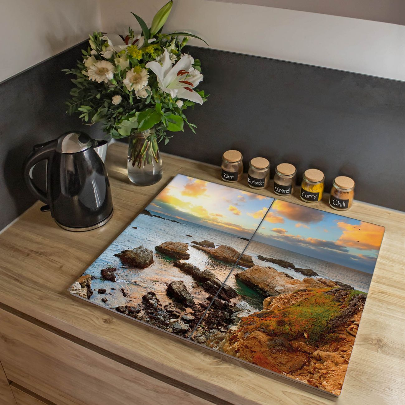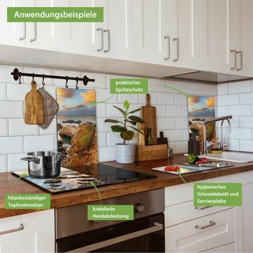 VIELSEITIG: Die Ceranfeldabdeckung ist vielseitig einsetzbar: ob als Spritzschutz hinter dem Herd für Ihre Küche oder als Glas Schneidebrett als hygienische und geruchsneutrale Unterlage. Sie können ebenfalls heiße Töpfe und Pfannen bis 100°C auf der Herdplattenabdeckung abstellen. Sie erhalten ein Multitalent für Ihre Küche. Die banjado Herdabdeckplatte aus Glas mit Motiv Sonnenaufgang am Meer verdeckt mit einem schönen Motiv Ihr Ceranfeld bzw. Ihren Induktionsherd. Die Herdabdeckplatte ist vielseitig einsetzbar und passt sich dabei Ihrem Einrichtungsstil an. DESIGN: Die Herdabdeckung Sonnenaufgang am Meer besteht aus hochwertigem, gehärtetem Glas mit einem unserer zahlreichen Motive. Sie haben die Wahl zwischen verschiedenen Maßen von einteiligen, zweiteiligen und einer dreiteiligen Herdabdeckung. Wählen Sie was zu Ihrer Einrichtung passt! DETAILS: Die Herdabdeckplatte ist vielseitig einsetzbar. Die Ecken sind für mehr Sicherheit dezent abgerundet, das Glas ist gehärtet. Sie erhalten separate Gummi Abstandshalter, damit Ihre Abdeckung rutschfest auf dem Herd steht. Diese können Sie frei positionieren, sodass die Herdabdeckung perfekt auf Ihrem Ceranfeld sitzt. BANJADO: Wir sind ein kleines Team aus dem Herzen von Sachsen und fertigen jeden Artikel nach Bestellung eigens für Sie an. Sie erhalten also keine preiswerte Importware, sondern Handarbeit. Auf Wunsch sind auch andere Farben und Größen möglich, kontakierten Sie uns gern.