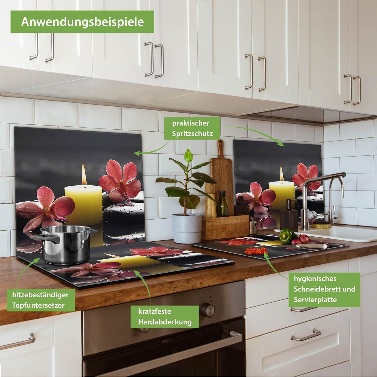 VIELSEITIG: Die Ceranfeldabdeckung ist vielseitig einsetzbar: ob als Spritzschutz hinter dem Herd für Ihre Küche oder als Glas Schneidebrett als hygienische und geruchsneutrale Unterlage. Sie können ebenfalls heiße Töpfe und Pfannen bis 100°C auf der Herdplattenabdeckung abstellen. Sie erhalten ein Multitalent für Ihre Küche. Die banjado Herdabdeckplatte aus Glas mit Motiv Steine & Relax 5 verdeckt mit einem schönen Motiv Ihr Ceranfeld bzw. Ihren Induktionsherd. Die Herdabdeckplatte ist vielseitig einsetzbar und passt sich dabei Ihrem Einrichtungsstil an. DESIGN: Die Herdabdeckung Steine & Relax 5 besteht aus hochwertigem, gehärtetem Glas mit einem unserer zahlreichen Motive. Sie haben die Wahl zwischen verschiedenen Maßen von einteiligen, zweiteiligen und einer dreiteiligen Herdabdeckung. Wählen Sie was zu Ihrer Einrichtung passt! DETAILS: Die Herdabdeckplatte ist vielseitig einsetzbar. Die Ecken sind für mehr Sicherheit dezent abgerundet, das Glas ist gehärtet. Sie erhalten separate Gummi Abstandshalter, damit Ihre Abdeckung rutschfest auf dem Herd steht. Diese können Sie frei positionieren, sodass die Herdabdeckung perfekt auf Ihrem Ceranfeld sitzt. BANJADO: Wir sind ein kleines Team aus dem Herzen von Sachsen und fertigen jeden Artikel nach Bestellung eigens für Sie an. Sie erhalten also keine preiswerte Importware, sondern Handarbeit. Auf Wunsch sind auch andere Farben und Größen möglich, kontakierten Sie uns gern.