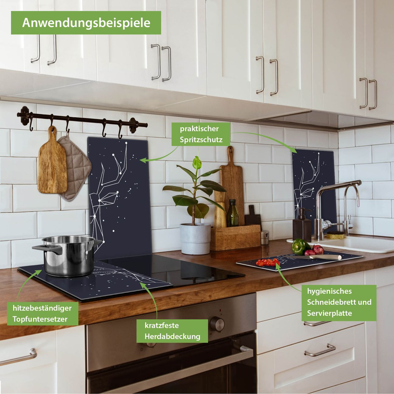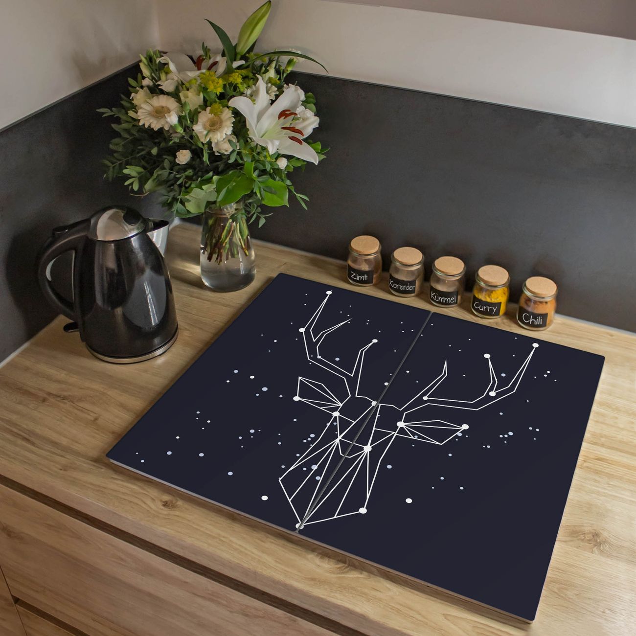 VIELSEITIG: Die Ceranfeldabdeckung ist vielseitig einsetzbar: ob als Spritzschutz hinter dem Herd für Ihre Küche oder als Glas Schneidebrett als hygienische und geruchsneutrale Unterlage. Sie können ebenfalls heiße Töpfe und Pfannen bis 100°C auf der Herdplattenabdeckung abstellen. Sie erhalten ein Multitalent für Ihre Küche. Die banjado Herdabdeckplatte aus Glas mit Motiv Sternbild Hirsch verdeckt mit einem schönen Motiv Ihr Ceranfeld bzw. Ihren Induktionsherd. Die Herdabdeckplatte ist vielseitig einsetzbar und passt sich dabei Ihrem Einrichtungsstil an. DESIGN: Die Herdabdeckung Sternbild Hirsch besteht aus hochwertigem, gehärtetem Glas mit einem unserer zahlreichen Motive. Sie haben die Wahl zwischen verschiedenen Maßen von einteiligen, zweiteiligen und einer dreiteiligen Herdabdeckung. Wählen Sie was zu Ihrer Einrichtung passt! DETAILS: Die Herdabdeckplatte ist vielseitig einsetzbar. Die Ecken sind für mehr Sicherheit dezent abgerundet, das Glas ist gehärtet. Sie erhalten separate Gummi Abstandshalter, damit Ihre Abdeckung rutschfest auf dem Herd steht. Diese können Sie frei positionieren, sodass die Herdabdeckung perfekt auf Ihrem Ceranfeld sitzt. BANJADO: Wir sind ein kleines Team aus dem Herzen von Sachsen und fertigen jeden Artikel nach Bestellung eigens für Sie an. Sie erhalten also keine preiswerte Importware, sondern Handarbeit. Auf Wunsch sind auch andere Farben und Größen möglich, kontakierten Sie uns gern.