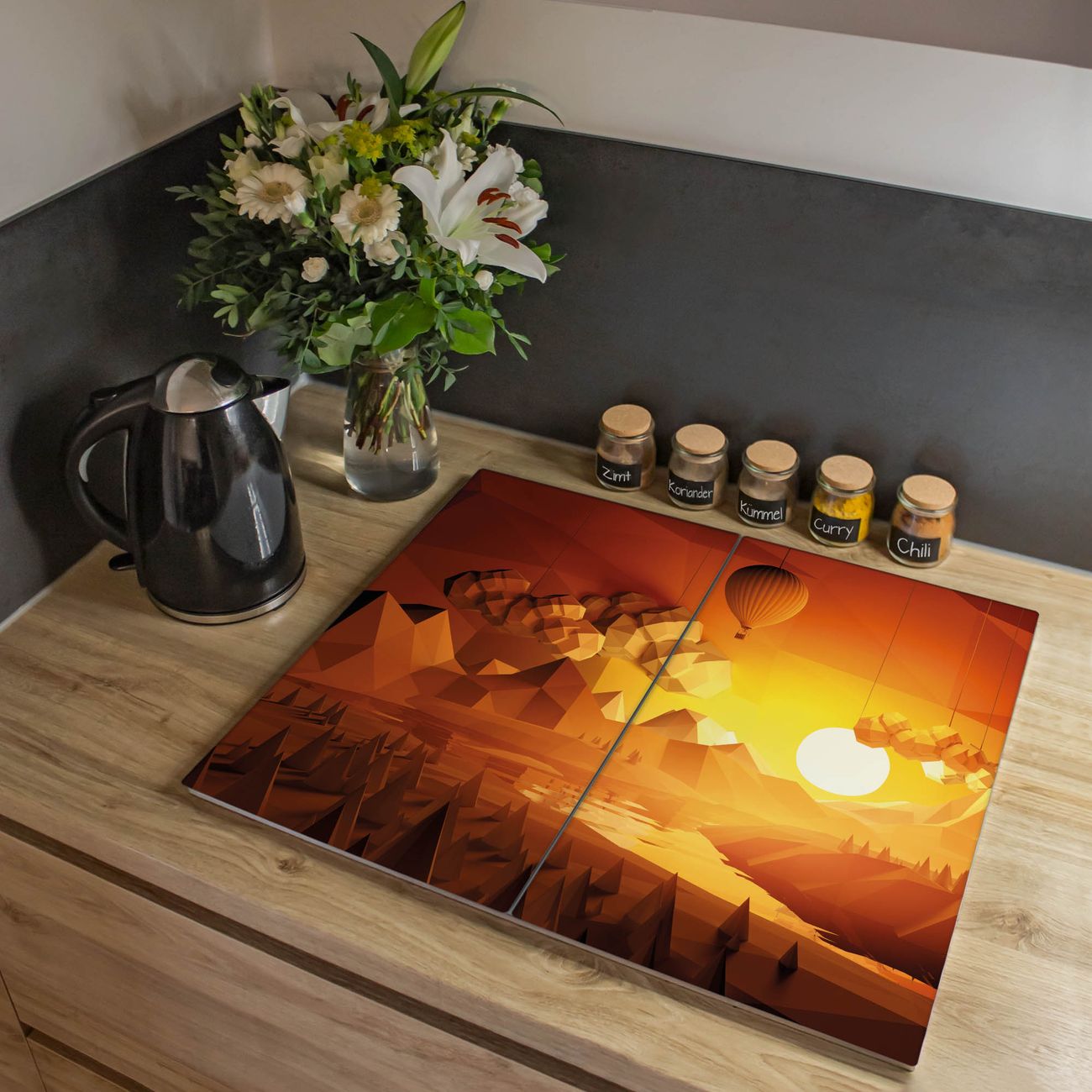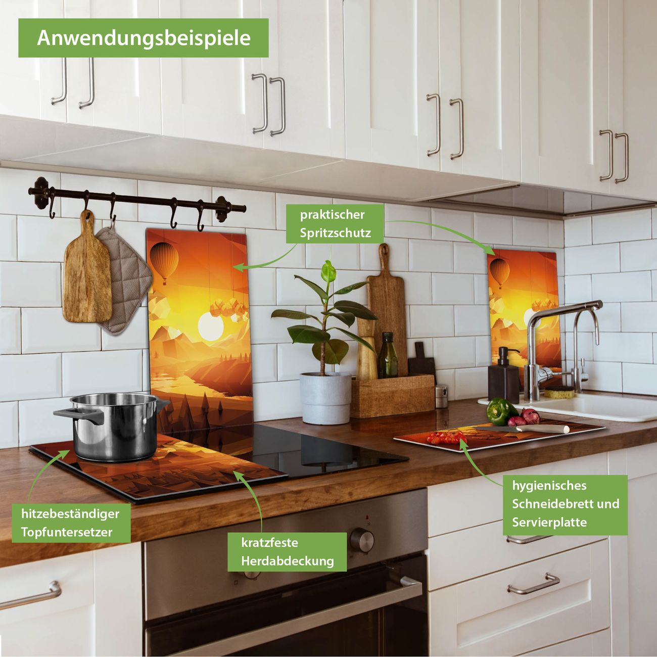 VIELSEITIG: Die Ceranfeldabdeckung ist vielseitig einsetzbar: ob als Spritzschutz hinter dem Herd für Ihre Küche oder als Glas Schneidebrett als hygienische und geruchsneutrale Unterlage. Sie können ebenfalls heiße Töpfe und Pfannen bis 100°C auf der Herdplattenabdeckung abstellen. Sie erhalten ein Multitalent für Ihre Küche. Die banjado Herdabdeckplatte aus Glas mit Motiv Sunset verdeckt mit einem schönen Motiv Ihr Ceranfeld bzw. Ihren Induktionsherd. Die Herdabdeckplatte ist vielseitig einsetzbar und passt sich dabei Ihrem Einrichtungsstil an. DESIGN: Die Herdabdeckung Sunset besteht aus hochwertigem, gehärtetem Glas mit einem unserer zahlreichen Motive. Sie haben die Wahl zwischen verschiedenen Maßen von einteiligen, zweiteiligen und einer dreiteiligen Herdabdeckung. Wählen Sie was zu Ihrer Einrichtung passt! DETAILS: Die Herdabdeckplatte ist vielseitig einsetzbar. Die Ecken sind für mehr Sicherheit dezent abgerundet, das Glas ist gehärtet. Sie erhalten separate Gummi Abstandshalter, damit Ihre Abdeckung rutschfest auf dem Herd steht. Diese können Sie frei positionieren, sodass die Herdabdeckung perfekt auf Ihrem Ceranfeld sitzt. BANJADO: Wir sind ein kleines Team aus dem Herzen von Sachsen und fertigen jeden Artikel nach Bestellung eigens für Sie an. Sie erhalten also keine preiswerte Importware, sondern Handarbeit. Auf Wunsch sind auch andere Farben und Größen möglich, kontakierten Sie uns gern.