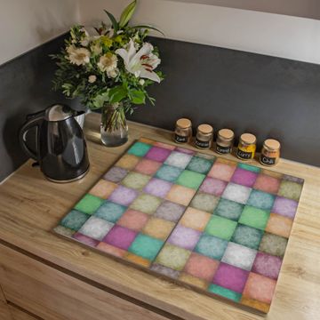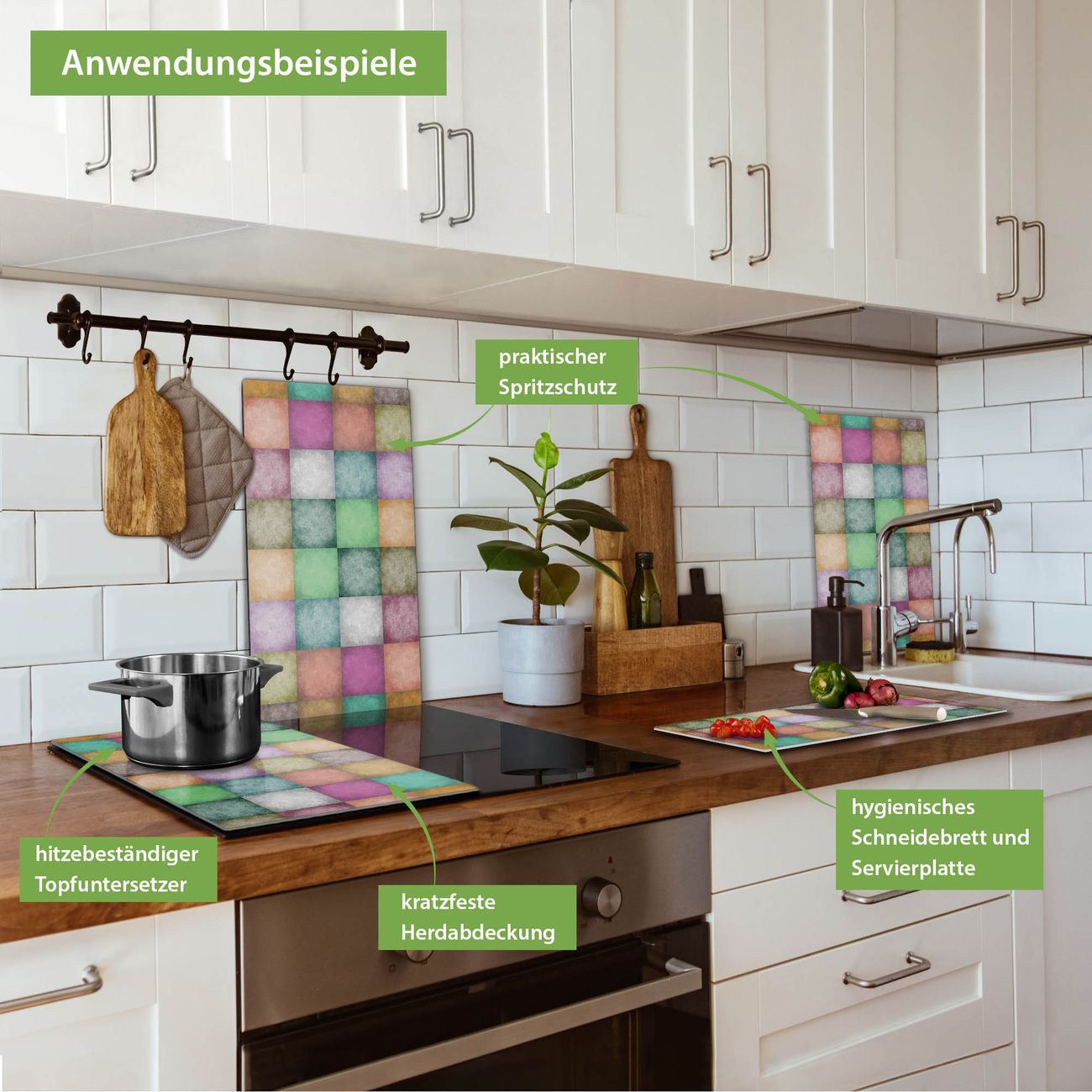 VIELSEITIG: Die Ceranfeldabdeckung ist vielseitig einsetzbar: ob als Spritzschutz hinter dem Herd für Ihre Küche oder als Glas Schneidebrett als hygienische und geruchsneutrale Unterlage. Sie können ebenfalls heiße Töpfe und Pfannen bis 100°C auf der Herdplattenabdeckung abstellen. Sie erhalten ein Multitalent für Ihre Küche. Die banjado Herdabdeckplatte aus Glas mit Motiv Verwaschene Quadrate verdeckt mit einem schönen Motiv Ihr Ceranfeld bzw. Ihren Induktionsherd. Die Herdabdeckplatte ist vielseitig einsetzbar und passt sich dabei Ihrem Einrichtungsstil an. DESIGN: Die Herdabdeckung Verwaschene Quadrate besteht aus hochwertigem, gehärtetem Glas mit einem unserer zahlreichen Motive. Sie haben die Wahl zwischen verschiedenen Maßen von einteiligen, zweiteiligen und einer dreiteiligen Herdabdeckung. Wählen Sie was zu Ihrer Einrichtung passt! DETAILS: Die Herdabdeckplatte ist vielseitig einsetzbar. Die Ecken sind für mehr Sicherheit dezent abgerundet, das Glas ist gehärtet. Sie erhalten separate Gummi Abstandshalter, damit Ihre Abdeckung rutschfest auf dem Herd steht. Diese können Sie frei positionieren, sodass die Herdabdeckung perfekt auf Ihrem Ceranfeld sitzt. BANJADO: Wir sind ein kleines Team aus dem Herzen von Sachsen und fertigen jeden Artikel nach Bestellung eigens für Sie an. Sie erhalten also keine preiswerte Importware, sondern Handarbeit. Auf Wunsch sind auch andere Farben und Größen möglich, kontakierten Sie uns gern.