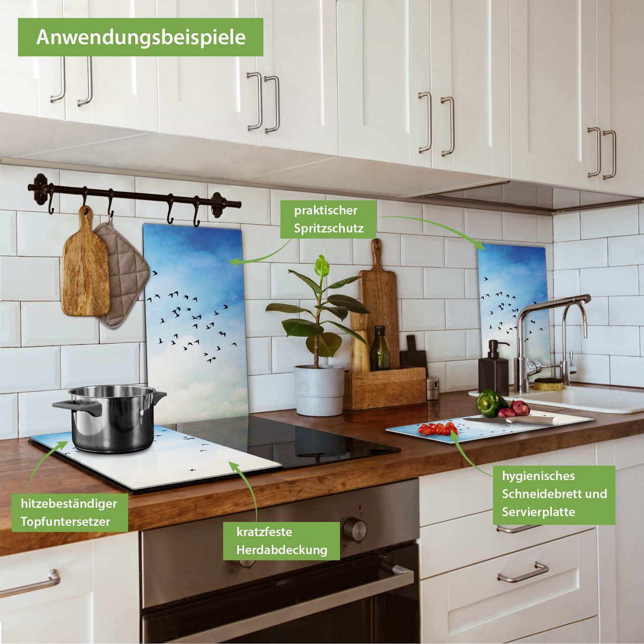 VIELSEITIG: Die Ceranfeldabdeckung ist vielseitig einsetzbar: ob als Spritzschutz hinter dem Herd für Ihre Küche oder als Glas Schneidebrett als hygienische und geruchsneutrale Unterlage. Sie können ebenfalls heiße Töpfe und Pfannen bis 100°C auf der Herdplattenabdeckung abstellen. Sie erhalten ein Multitalent für Ihre Küche. Die banjado Herdabdeckplatte aus Glas mit Motiv Vögel am Himmel 2 verdeckt mit einem schönen Motiv Ihr Ceranfeld bzw. Ihren Induktionsherd. Die Herdabdeckplatte ist vielseitig einsetzbar und passt sich dabei Ihrem Einrichtungsstil an. DESIGN: Die Herdabdeckung Vögel am Himmel 2 besteht aus hochwertigem, gehärtetem Glas mit einem unserer zahlreichen Motive. Sie haben die Wahl zwischen verschiedenen Maßen von einteiligen, zweiteiligen und einer dreiteiligen Herdabdeckung. Wählen Sie was zu Ihrer Einrichtung passt! DETAILS: Die Herdabdeckplatte ist vielseitig einsetzbar. Die Ecken sind für mehr Sicherheit dezent abgerundet, das Glas ist gehärtet. Sie erhalten separate Gummi Abstandshalter, damit Ihre Abdeckung rutschfest auf dem Herd steht. Diese können Sie frei positionieren, sodass die Herdabdeckung perfekt auf Ihrem Ceranfeld sitzt. BANJADO: Wir sind ein kleines Team aus dem Herzen von Sachsen und fertigen jeden Artikel nach Bestellung eigens für Sie an. Sie erhalten also keine preiswerte Importware, sondern Handarbeit. Auf Wunsch sind auch andere Farben und Größen möglich, kontakierten Sie uns gern.