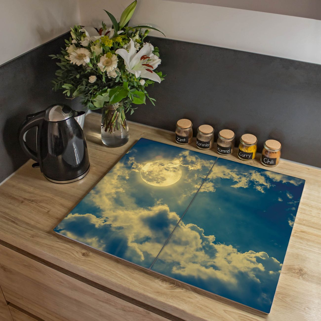 VIELSEITIG: Die Ceranfeldabdeckung ist vielseitig einsetzbar: ob als Spritzschutz hinter dem Herd für Ihre Küche oder als Glas Schneidebrett als hygienische und geruchsneutrale Unterlage. Sie können ebenfalls heiße Töpfe und Pfannen bis 100°C auf der Herdplattenabdeckung abstellen. Sie erhalten ein Multitalent für Ihre Küche. Die banjado Herdabdeckplatte aus Glas mit Motiv Vollmond 2 verdeckt mit einem schönen Motiv Ihr Ceranfeld bzw. Ihren Induktionsherd. Die Herdabdeckplatte ist vielseitig einsetzbar und passt sich dabei Ihrem Einrichtungsstil an. DESIGN: Die Herdabdeckung Vollmond 2 besteht aus hochwertigem, gehärtetem Glas mit einem unserer zahlreichen Motive. Sie haben die Wahl zwischen verschiedenen Maßen von einteiligen, zweiteiligen und einer dreiteiligen Herdabdeckung. Wählen Sie was zu Ihrer Einrichtung passt! DETAILS: Die Herdabdeckplatte ist vielseitig einsetzbar. Die Ecken sind für mehr Sicherheit dezent abgerundet, das Glas ist gehärtet. Sie erhalten separate Gummi Abstandshalter, damit Ihre Abdeckung rutschfest auf dem Herd steht. Diese können Sie frei positionieren, sodass die Herdabdeckung perfekt auf Ihrem Ceranfeld sitzt. BANJADO: Wir sind ein kleines Team aus dem Herzen von Sachsen und fertigen jeden Artikel nach Bestellung eigens für Sie an. Sie erhalten also keine preiswerte Importware, sondern Handarbeit. Auf Wunsch sind auch andere Farben und Größen möglich, kontakierten Sie uns gern.