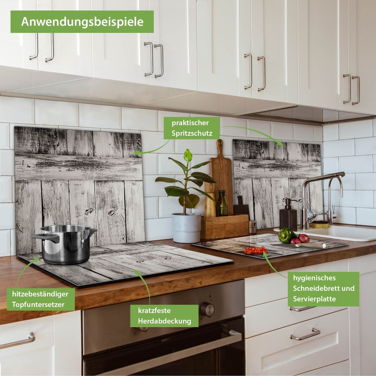 VIELSEITIG: Die Ceranfeldabdeckung ist vielseitig einsetzbar: ob als Spritzschutz hinter dem Herd für Ihre Küche oder als Glas Schneidebrett als hygienische und geruchsneutrale Unterlage. Sie können ebenfalls heiße Töpfe und Pfannen bis 100°C auf der Herdplattenabdeckung abstellen. Sie erhalten ein Multitalent für Ihre Küche. Die banjado Herdabdeckplatte aus Glas mit Motiv weiße Bretter verdeckt mit einem schönen Motiv Ihr Ceranfeld bzw. Ihren Induktionsherd. Die Herdabdeckplatte ist vielseitig einsetzbar und passt sich dabei Ihrem Einrichtungsstil an. DESIGN: Die Herdabdeckung weiße Bretter besteht aus hochwertigem, gehärtetem Glas mit einem unserer zahlreichen Motive. Sie haben die Wahl zwischen verschiedenen Maßen von einteiligen, zweiteiligen und einer dreiteiligen Herdabdeckung. Wählen Sie was zu Ihrer Einrichtung passt! DETAILS: Die Herdabdeckplatte ist vielseitig einsetzbar. Die Ecken sind für mehr Sicherheit dezent abgerundet, das Glas ist gehärtet. Sie erhalten separate Gummi Abstandshalter, damit Ihre Abdeckung rutschfest auf dem Herd steht. Diese können Sie frei positionieren, sodass die Herdabdeckung perfekt auf Ihrem Ceranfeld sitzt. BANJADO: Wir sind ein kleines Team aus dem Herzen von Sachsen und fertigen jeden Artikel nach Bestellung eigens für Sie an. Sie erhalten also keine preiswerte Importware, sondern Handarbeit. Auf Wunsch sind auch andere Farben und Größen möglich, kontakierten Sie uns gern.