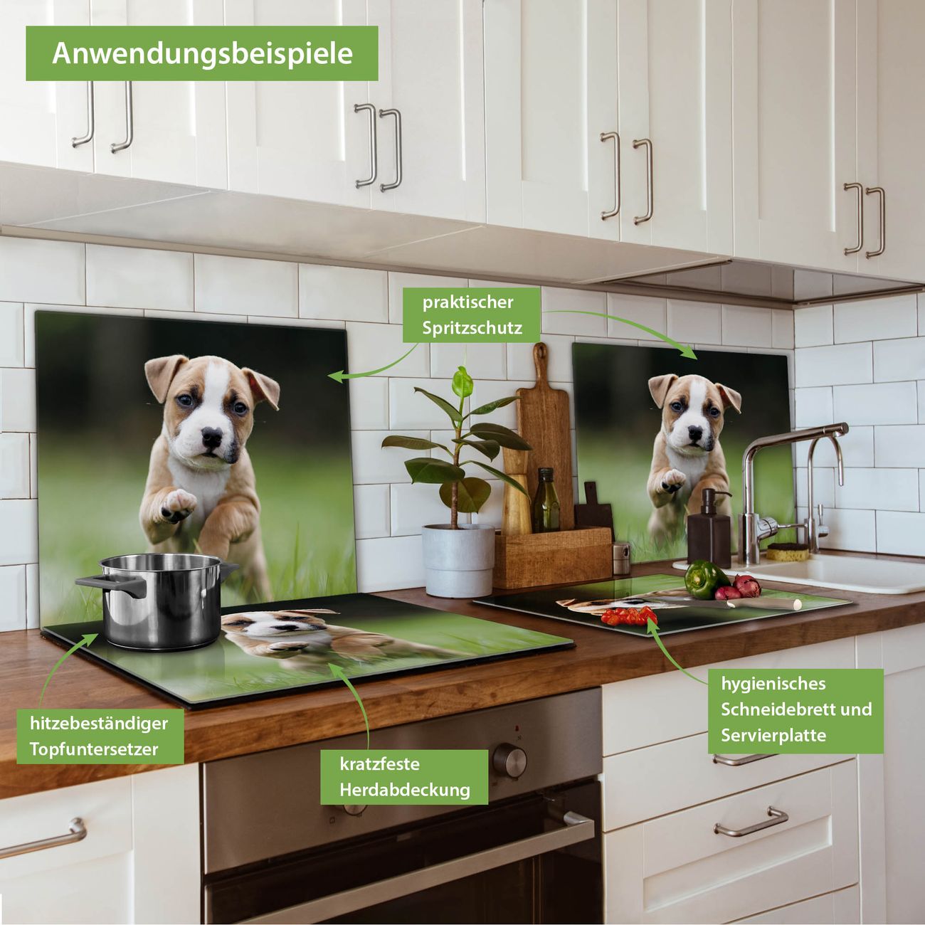 VIELSEITIG: Die Ceranfeldabdeckung ist vielseitig einsetzbar: ob als Spritzschutz hinter dem Herd für Ihre Küche oder als Glas Schneidebrett als hygienische und geruchsneutrale Unterlage. Sie können ebenfalls heiße Töpfe und Pfannen bis 100°C auf der Herdplattenabdeckung abstellen. Sie erhalten ein Multitalent für Ihre Küche. Die banjado Herdabdeckplatte aus Glas mit Motiv Welpe im Gras verdeckt mit einem schönen Motiv Ihr Ceranfeld bzw. Ihren Induktionsherd. Die Herdabdeckplatte ist vielseitig einsetzbar und passt sich dabei Ihrem Einrichtungsstil an. DESIGN: Die Herdabdeckung Welpe im Gras besteht aus hochwertigem, gehärtetem Glas mit einem unserer zahlreichen Motive. Sie haben die Wahl zwischen verschiedenen Maßen von einteiligen, zweiteiligen und einer dreiteiligen Herdabdeckung. Wählen Sie was zu Ihrer Einrichtung passt! DETAILS: Die Herdabdeckplatte ist vielseitig einsetzbar. Die Ecken sind für mehr Sicherheit dezent abgerundet, das Glas ist gehärtet. Sie erhalten separate Gummi Abstandshalter, damit Ihre Abdeckung rutschfest auf dem Herd steht. Diese können Sie frei positionieren, sodass die Herdabdeckung perfekt auf Ihrem Ceranfeld sitzt. BANJADO: Wir sind ein kleines Team aus dem Herzen von Sachsen und fertigen jeden Artikel nach Bestellung eigens für Sie an. Sie erhalten also keine preiswerte Importware, sondern Handarbeit. Auf Wunsch sind auch andere Farben und Größen möglich, kontakierten Sie uns gern.