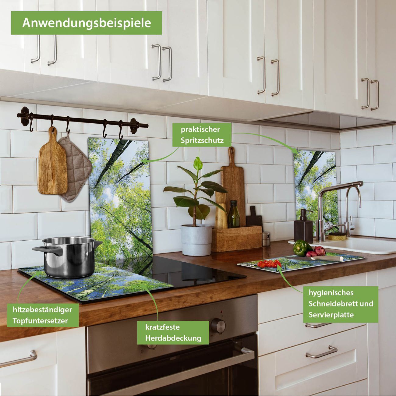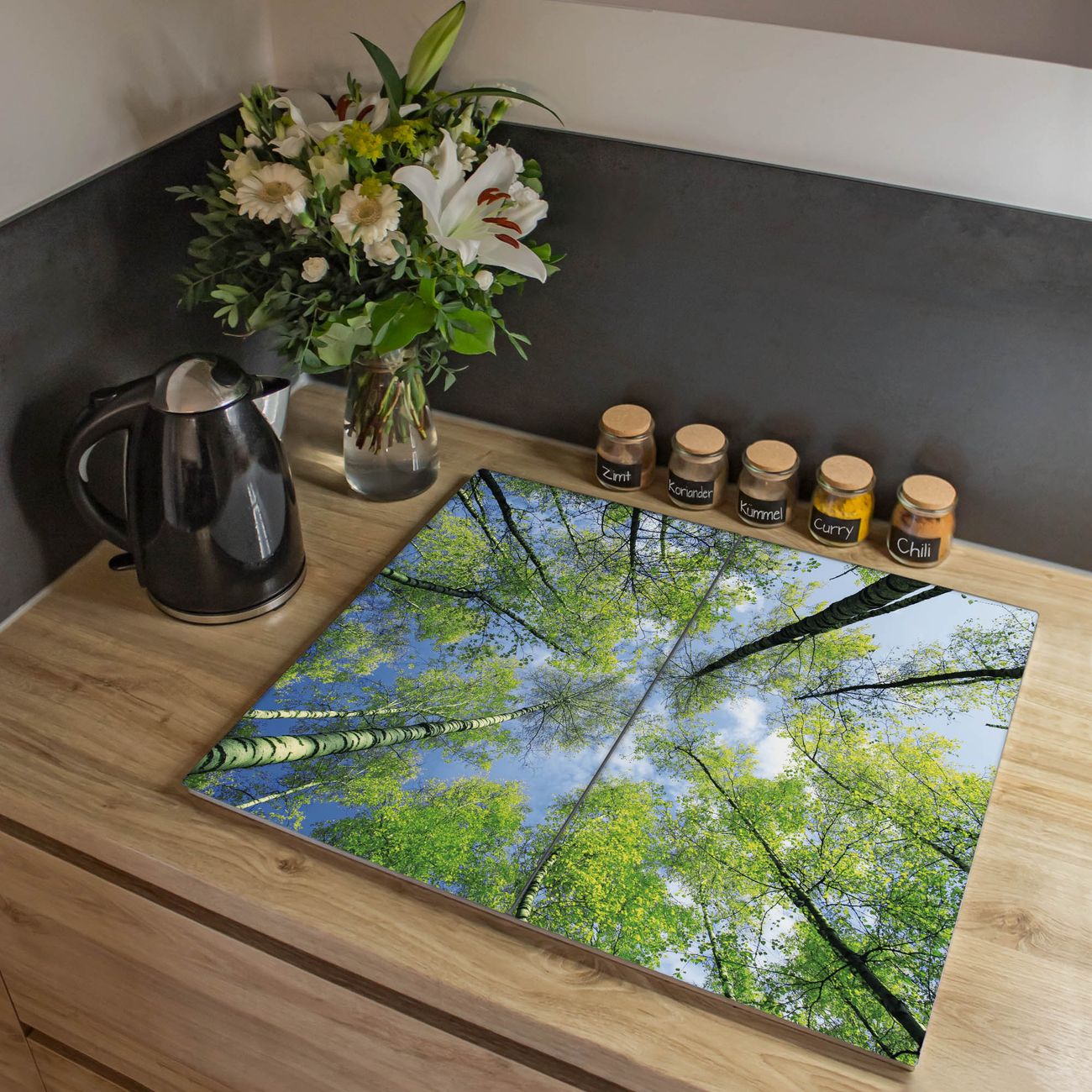VIELSEITIG: Die Ceranfeldabdeckung ist vielseitig einsetzbar: ob als Spritzschutz hinter dem Herd für Ihre Küche oder als Glas Schneidebrett als hygienische und geruchsneutrale Unterlage. Sie können ebenfalls heiße Töpfe und Pfannen bis 100°C auf der Herdplattenabdeckung abstellen. Sie erhalten ein Multitalent für Ihre Küche. Die banjado Herdabdeckplatte aus Glas mit Motiv Zwischen Bäumen 3 verdeckt mit einem schönen Motiv Ihr Ceranfeld bzw. Ihren Induktionsherd. Die Herdabdeckplatte ist vielseitig einsetzbar und passt sich dabei Ihrem Einrichtungsstil an. DESIGN: Die Herdabdeckung Zwischen Bäumen 3 besteht aus hochwertigem, gehärtetem Glas mit einem unserer zahlreichen Motive. Sie haben die Wahl zwischen verschiedenen Maßen von einteiligen, zweiteiligen und einer dreiteiligen Herdabdeckung. Wählen Sie was zu Ihrer Einrichtung passt! DETAILS: Die Herdabdeckplatte ist vielseitig einsetzbar. Die Ecken sind für mehr Sicherheit dezent abgerundet, das Glas ist gehärtet. Sie erhalten separate Gummi Abstandshalter, damit Ihre Abdeckung rutschfest auf dem Herd steht. Diese können Sie frei positionieren, sodass die Herdabdeckung perfekt auf Ihrem Ceranfeld sitzt. BANJADO: Wir sind ein kleines Team aus dem Herzen von Sachsen und fertigen jeden Artikel nach Bestellung eigens für Sie an. Sie erhalten also keine preiswerte Importware, sondern Handarbeit. Auf Wunsch sind auch andere Farben und Größen möglich, kontakierten Sie uns gern.