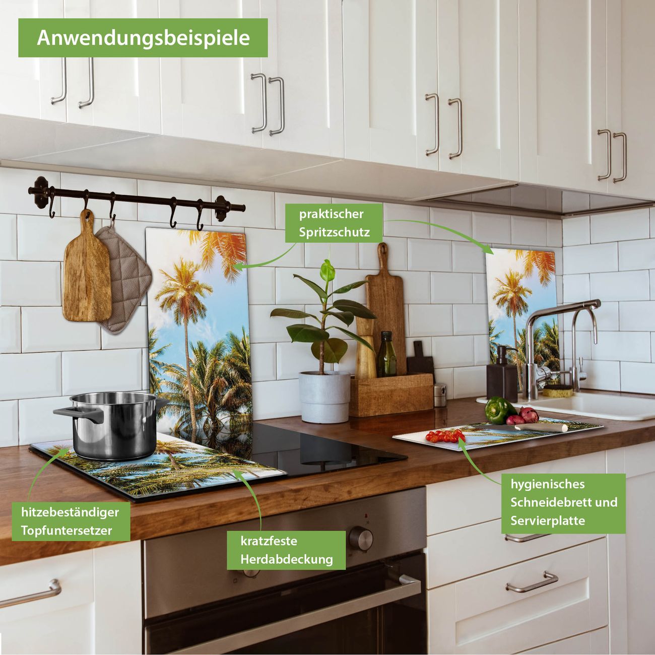 VIELSEITIG: Die Ceranfeldabdeckung ist vielseitig einsetzbar: ob als Spritzschutz hinter dem Herd für Ihre Küche oder als Glas Schneidebrett als hygienische und geruchsneutrale Unterlage. Sie können ebenfalls heiße Töpfe und Pfannen bis 100°C auf der Herdplattenabdeckung abstellen. Sie erhalten ein Multitalent für Ihre Küche. Die banjado Herdabdeckplatte aus Glas mit Motiv Zwischen Palmen verdeckt mit einem schönen Motiv Ihr Ceranfeld bzw. Ihren Induktionsherd. Die Herdabdeckplatte ist vielseitig einsetzbar und passt sich dabei Ihrem Einrichtungsstil an. DESIGN: Die Herdabdeckung Zwischen Palmen besteht aus hochwertigem, gehärtetem Glas mit einem unserer zahlreichen Motive. Sie haben die Wahl zwischen verschiedenen Maßen von einteiligen, zweiteiligen und einer dreiteiligen Herdabdeckung. Wählen Sie was zu Ihrer Einrichtung passt! DETAILS: Die Herdabdeckplatte ist vielseitig einsetzbar. Die Ecken sind für mehr Sicherheit dezent abgerundet, das Glas ist gehärtet. Sie erhalten separate Gummi Abstandshalter, damit Ihre Abdeckung rutschfest auf dem Herd steht. Diese können Sie frei positionieren, sodass die Herdabdeckung perfekt auf Ihrem Ceranfeld sitzt. BANJADO: Wir sind ein kleines Team aus dem Herzen von Sachsen und fertigen jeden Artikel nach Bestellung eigens für Sie an. Sie erhalten also keine preiswerte Importware, sondern Handarbeit. Auf Wunsch sind auch andere Farben und Größen möglich, kontakierten Sie uns gern.