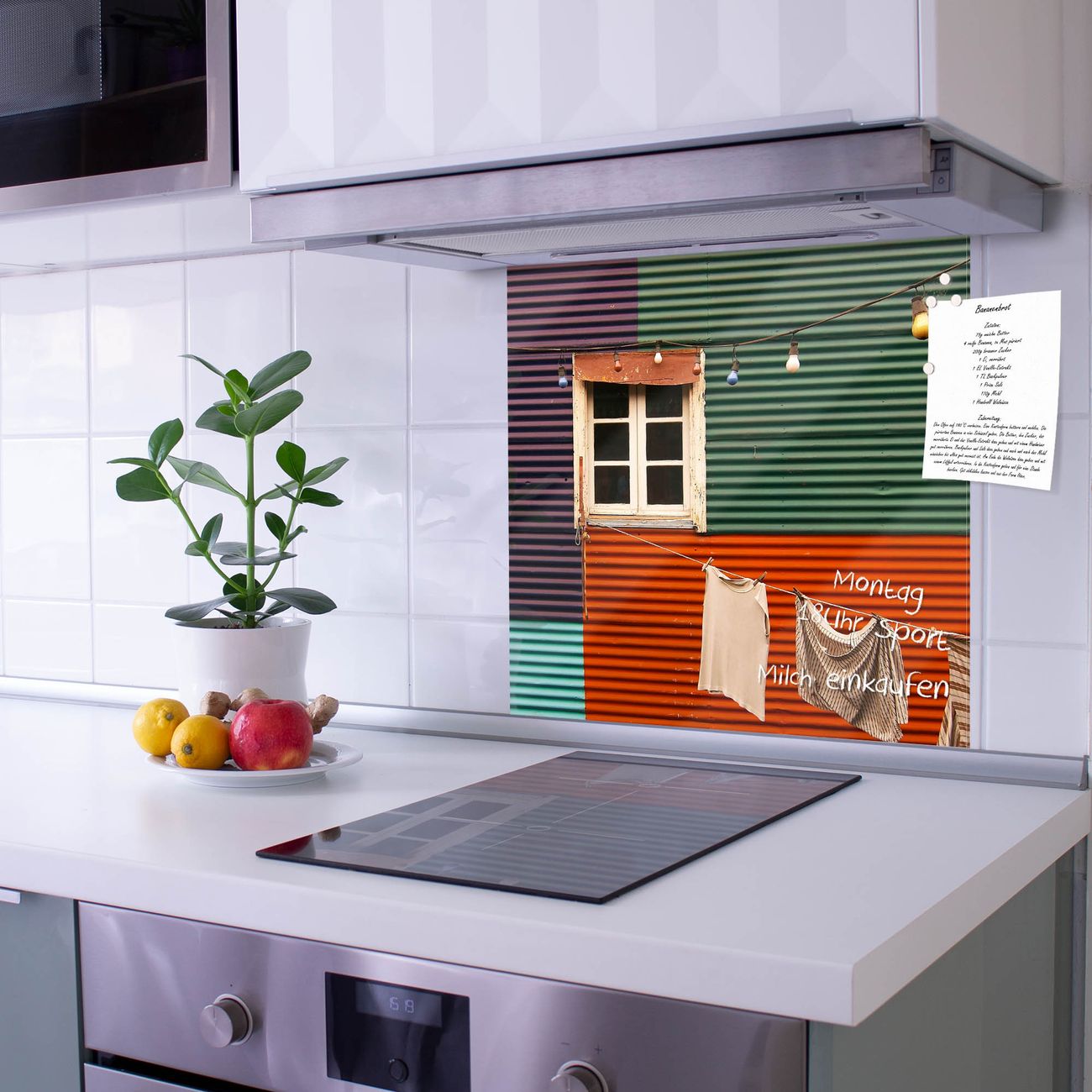 Die Küchenrückwand ist eine elegante Mehrzwecktafel: als Spritzschutz hinter Herd oder Waschbecken, hält Notizen wie ein Memoboard, ist beschreibbar mit Kreidestiften oder Whiteboard-Markern, sieht umwerfend als Glasbild aus. Sie besteht aus gehärtetem Glas, die Rückwand aus einem magnetischen Stahlblech. Durch die superflache Bauweise haben Sie die Wahl aus einer Vielzahl von Befestigungsmöglichkeiten. Sie können die Küchenrückwand mit einem Montagekleber superflach an die Wand kleben oder Sie wählen eines unserer passenden Befestigungssets, welches eine optimale Montage garantiert. Die Küchenrückwand besteht aus zertifiziertem Sicherheitsglas. Durch die mitgelieferten 4 Neodym-Magnete ist Ihre Glas Magnettafel sofort einsatzbereit.