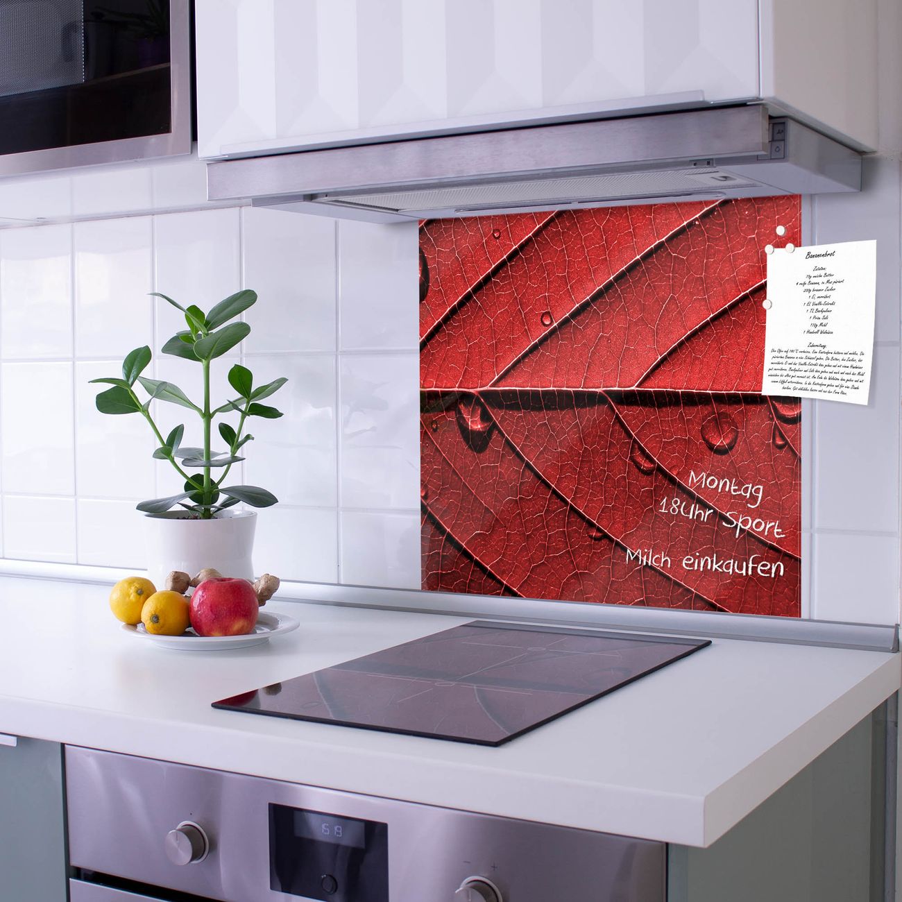 Die Küchenrückwand ist eine elegante Mehrzwecktafel: als Spritzschutz hinter Herd oder Waschbecken, hält Notizen wie ein Memoboard, ist beschreibbar mit Kreidestiften oder Whiteboard-Markern, sieht umwerfend als Glasbild aus. Sie besteht aus gehärtetem Glas, die Rückwand aus einem magnetischen Stahlblech. Durch die superflache Bauweise haben Sie die Wahl aus einer Vielzahl von Befestigungsmöglichkeiten. Sie können die Küchenrückwand mit einem Montagekleber superflach an die Wand kleben oder Sie wählen eines unserer passenden Befestigungssets, welches eine optimale Montage garantiert. Die Küchenrückwand besteht aus zertifiziertem Sicherheitsglas. Durch die mitgelieferten 4 Neodym-Magnete ist Ihre Glas Magnettafel sofort einsatzbereit.