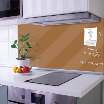 Die banjado Glas Küchenrückwand in verschiedenen Größen mit Farbe Kupfer Metallic schützt Ihre Küchenfliesen vor Fettspritzern oder Wasserflecken. Der Spritzschutz ist gleichzeitig magnetisch und hält Ihre Rezepte oder Einkaufslisten. 4 Neodym-Magnete und 1 Kreidestift liegen bereits bei. Leuchtende Farbee und hochwertiges Material machen den Spritzschutz zum Designobjekt. Das dekorative Glasbild gibt Ihrer Küche ein individuelles Erscheinungsbild. Abgerundete Kanten und Sicherheitsglas sorgen für einen sicheren Einsatz.