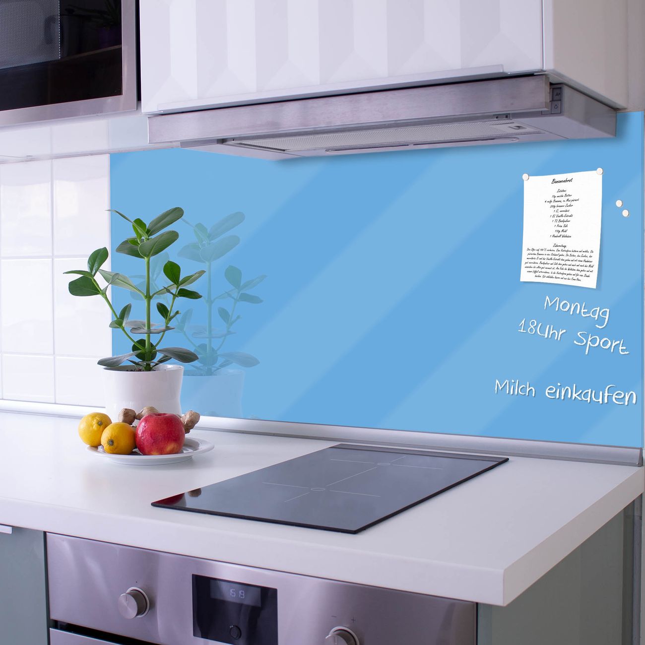 Die Küchenrückwand ist eine elegante Mehrzwecktafel: als Spritzschutz hinter Herd oder Waschbecken, hält Notizen wie ein Memoboard, ist beschreibbar mit Kreidestiften oder Whiteboard-Markern, sieht umwerfend als Glasbild aus. Sie besteht aus gehärtetem Glas, die Rückwand aus einem magnetischen Stahlblech. Durch die superflache Bauweise haben Sie die Wahl aus einer Vielzahl von Befestigungsmöglichkeiten. Sie können die Küchenrückwand mit einem Montagekleber superflach an die Wand kleben oder Sie wählen eines unserer passenden Befestigungssets, welches eine optimale Montage garantiert. Die Küchenrückwand besteht aus zertifiziertem Sicherheitsglas. Durch die mitgelieferten 4 Neodym-Magnete ist Ihre Glas Magnettafel sofort einsatzbereit.