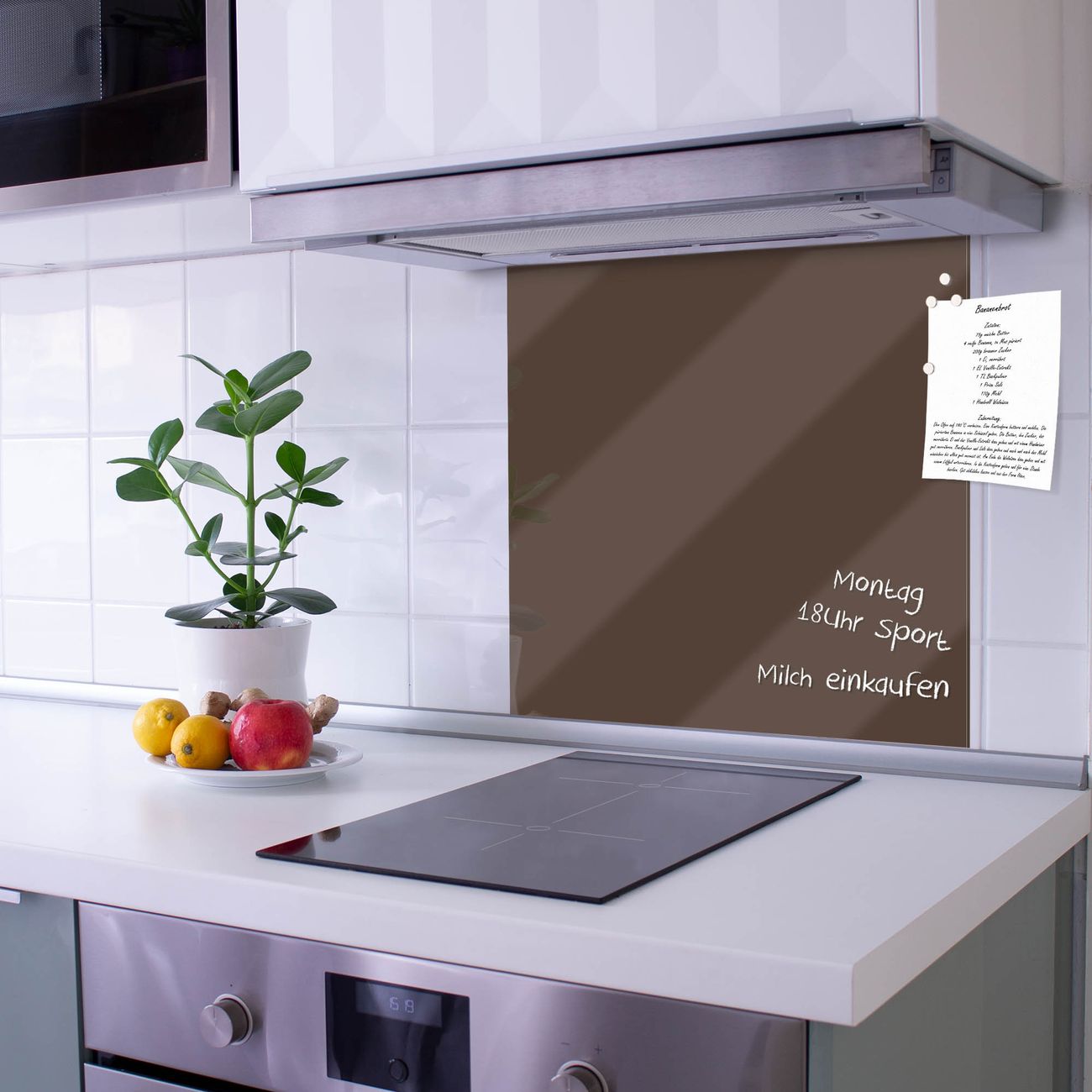 Die Küchenrückwand ist eine elegante Mehrzwecktafel: als Spritzschutz hinter Herd oder Waschbecken, hält Notizen wie ein Memoboard, ist beschreibbar mit Kreidestiften oder Whiteboard-Markern, sieht umwerfend als Glasbild aus. Sie besteht aus gehärtetem Glas, die Rückwand aus einem magnetischen Stahlblech. Durch die superflache Bauweise haben Sie die Wahl aus einer Vielzahl von Befestigungsmöglichkeiten. Sie können die Küchenrückwand mit einem Montagekleber superflach an die Wand kleben oder Sie wählen eines unserer passenden Befestigungssets, welches eine optimale Montage garantiert. Die Küchenrückwand besteht aus zertifiziertem Sicherheitsglas. Durch die mitgelieferten 4 Neodym-Magnete ist Ihre Glas Magnettafel sofort einsatzbereit.