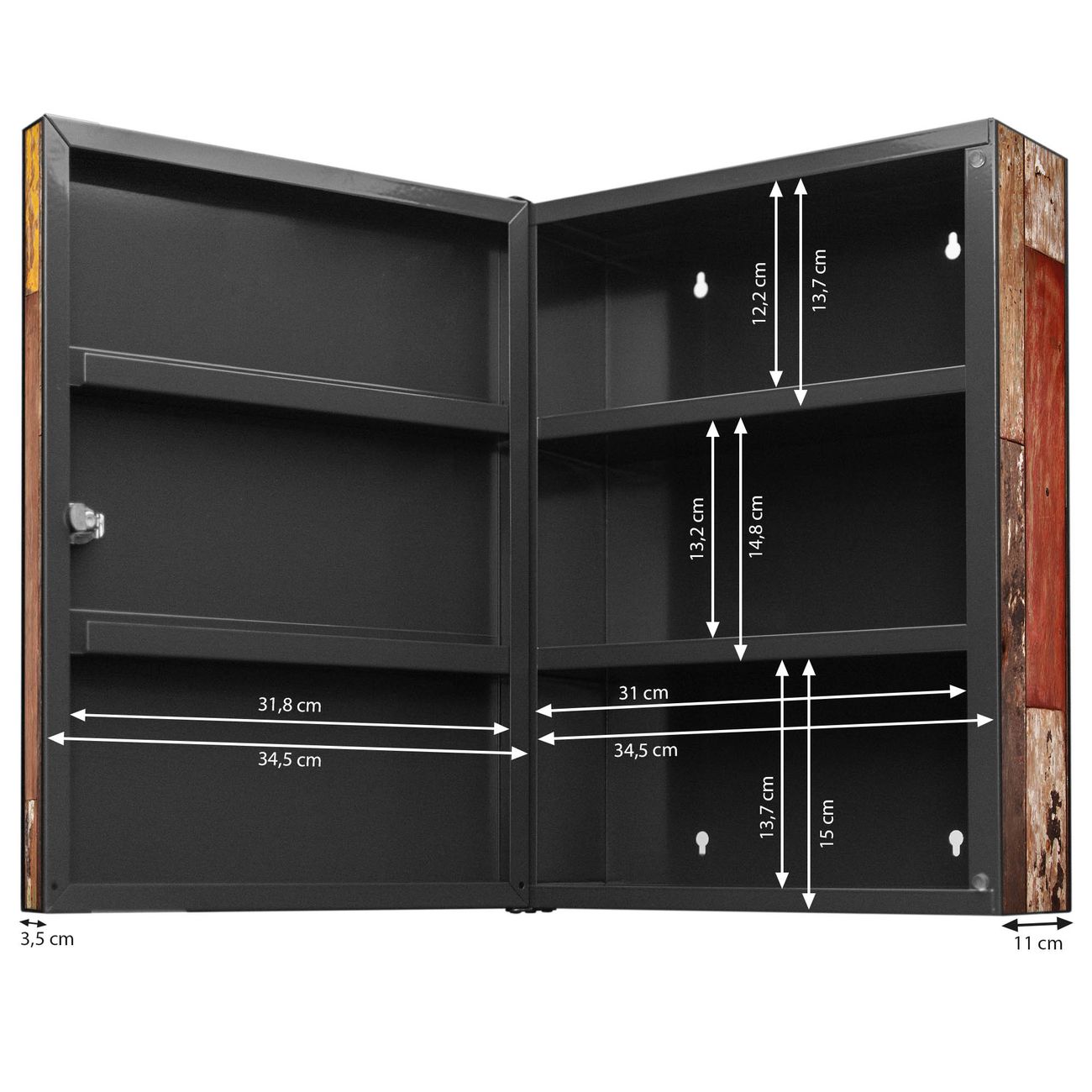 Der Medizinschrank ist gesamt 35x46x15cm groß und wiegt ca. 3900g. Der Türanschlag ist links und kann nicht verändert werden, die Fronttür öffnet ca. 115°. Die Folierung befindet sich auf der Front und den Seiten. Das Gehäuse ist zeitlos anthrazit und aus Stahl gefertigt. Die innenliegenden Fächer haben verschiedene Größen für unterschiedliche Aufbewahrungsmöglichkeiten, in der Innentür können ebenfalls Dinge abgelegt werden. Befestigt wird der Medizinschrank an 4 Stellen auf der Rückseite, Sie erhalten 3 Schlüssel.