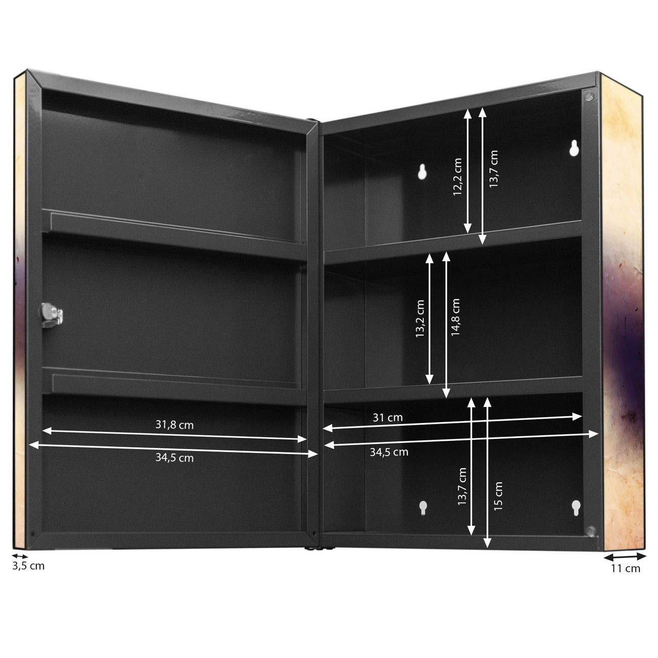 Der Medizinschrank ist gesamt 35x46x15cm groß und wiegt ca. 3900g. Der Türanschlag ist links und kann nicht verändert werden, die Fronttür öffnet ca. 115°. Die Folierung befindet sich auf der Front und den Seiten. Das Gehäuse ist zeitlos anthrazit und aus Stahl gefertigt. Die innenliegenden Fächer haben verschiedene Größen für unterschiedliche Aufbewahrungsmöglichkeiten, in der Innentür können ebenfalls Dinge abgelegt werden. Befestigt wird der Medizinschrank an 4 Stellen auf der Rückseite, Sie erhalten 3 Schlüssel.