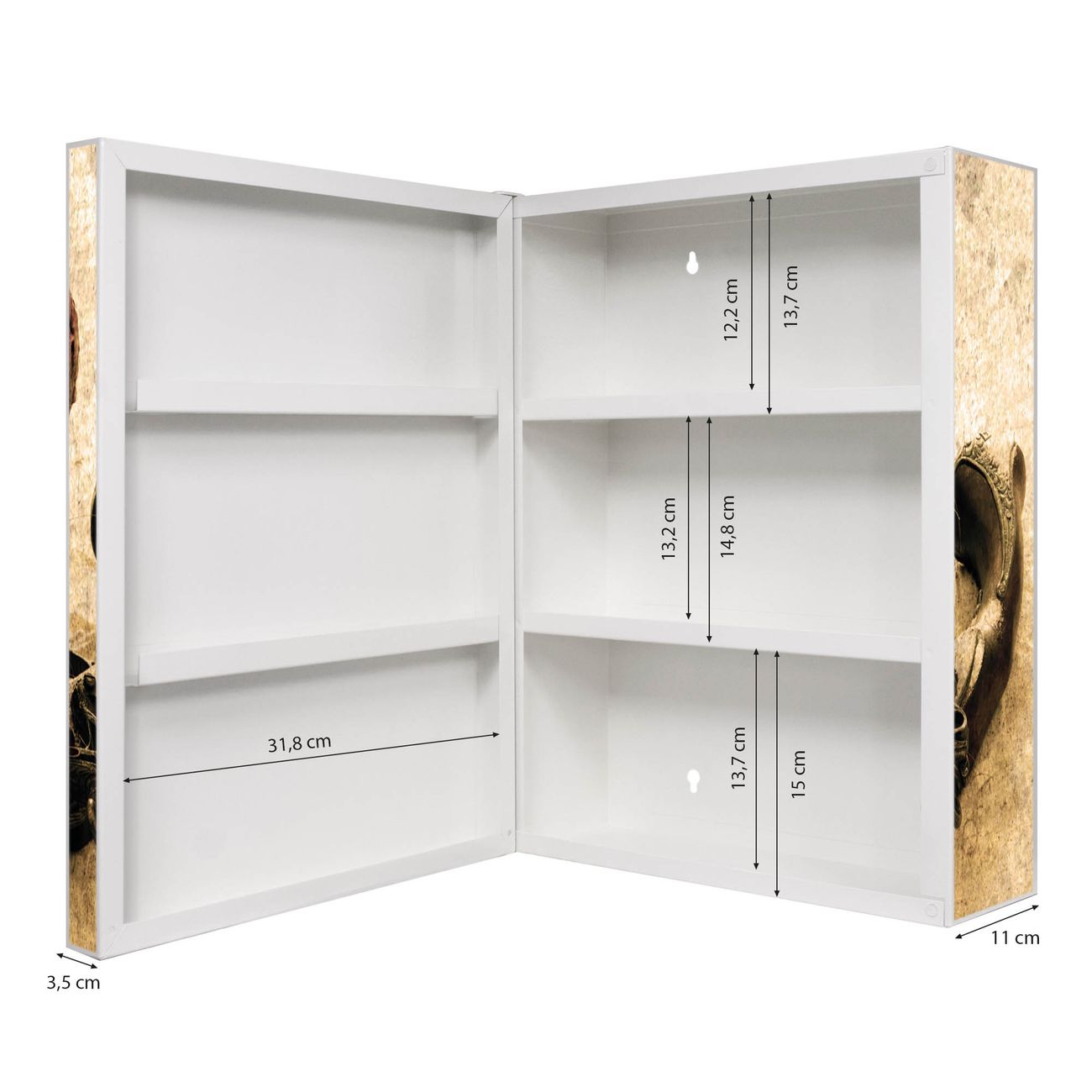 Der Medizinschrank ist gesamt 35x46x15cm groß und wiegt ca. 3900g. Der Türanschlag ist links und kann nicht verändert werden, die Fronttür öffnet ca. 115°. Die Folierung befindet sich auf der Front und den Seiten. Das Gehäuse ist zeitlos weiß und aus Stahl gefertigt. Die innenliegenden Fächer haben verschiedene Größen für unterschiedliche Aufbewahrungsmöglichkeiten, in der Innentür können ebenfalls Dinge abgelegt werden. Befestigt wird der Medizinschrank an 4 Stellen auf der Rückseite, Sie erhalten 3 Schlüssel.