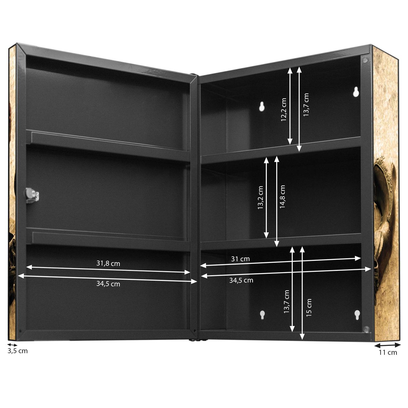 Der Medizinschrank ist gesamt 35x46x15cm groß und wiegt ca. 3900g. Der Türanschlag ist links und kann nicht verändert werden, die Fronttür öffnet ca. 115°. Die Folierung befindet sich auf der Front und den Seiten. Das Gehäuse ist zeitlos anthrazit und aus Stahl gefertigt. Die innenliegenden Fächer haben verschiedene Größen für unterschiedliche Aufbewahrungsmöglichkeiten, in der Innentür können ebenfalls Dinge abgelegt werden. Befestigt wird der Medizinschrank an 4 Stellen auf der Rückseite, Sie erhalten 3 Schlüssel.