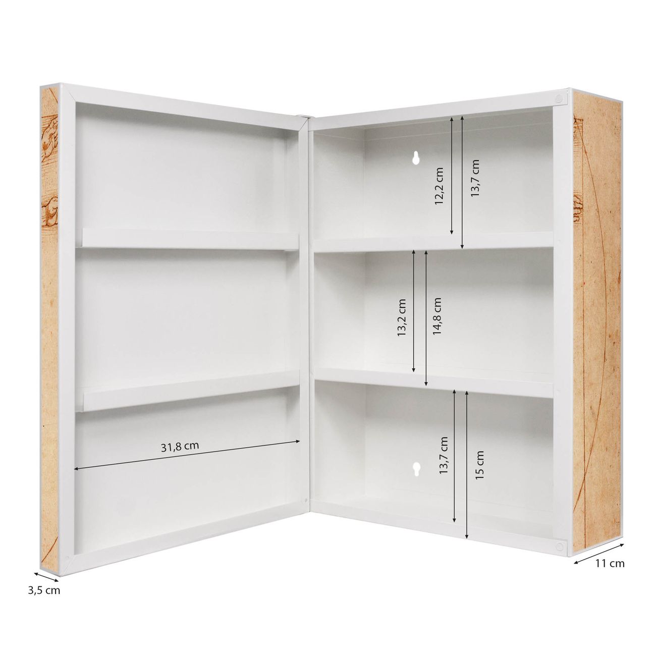 Der Medizinschrank ist gesamt 35x46x15cm groß und wiegt ca. 3900g. Der Türanschlag ist links und kann nicht verändert werden, die Fronttür öffnet ca. 115°. Die Folierung befindet sich auf der Front und den Seiten. Das Gehäuse ist zeitlos weiß und aus Stahl gefertigt. Die innenliegenden Fächer haben verschiedene Größen für unterschiedliche Aufbewahrungsmöglichkeiten, in der Innentür können ebenfalls Dinge abgelegt werden. Befestigt wird der Medizinschrank an 4 Stellen auf der Rückseite, Sie erhalten 3 Schlüssel.