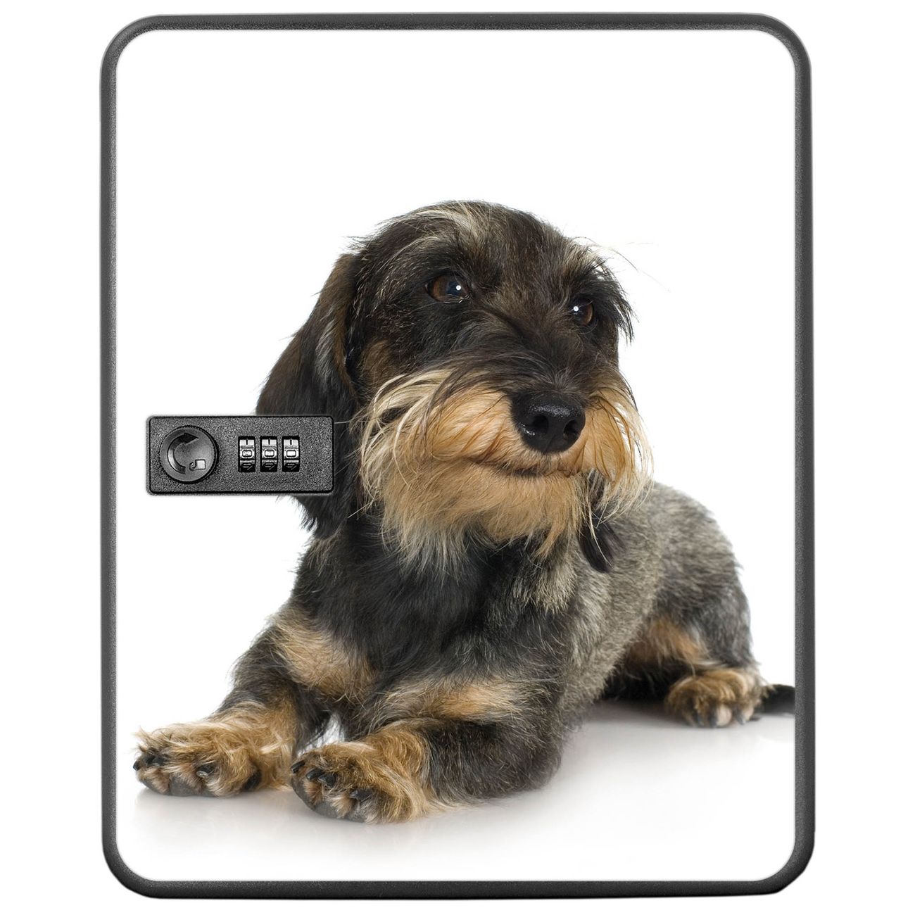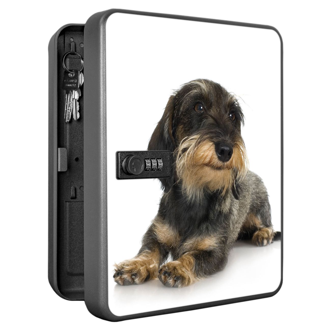 Der Schlüsselkasten ist gesamt 30x24x9,3cm groß und wiegt ca. 1500g. Die komplette Schlüsselaufbewahrung besteht aus schwarzem pulverbeschichtetem Stahl und wird von uns auf der Front mit einer Motivfolie kaschiert.