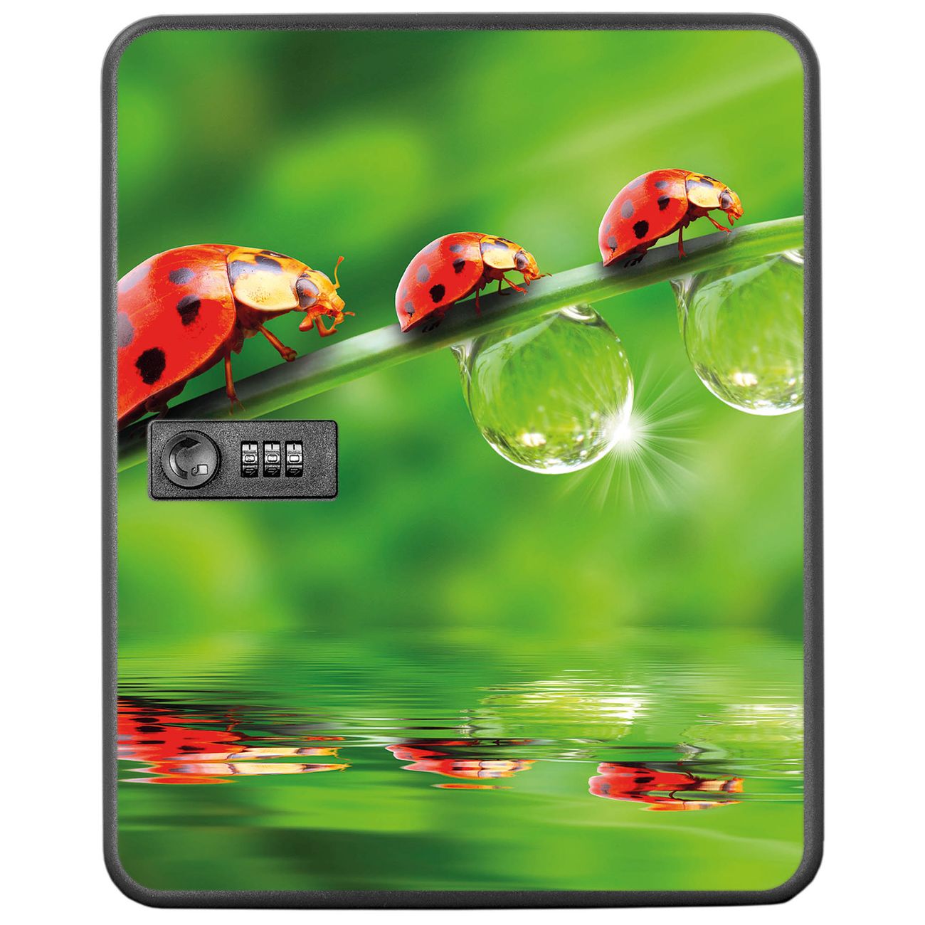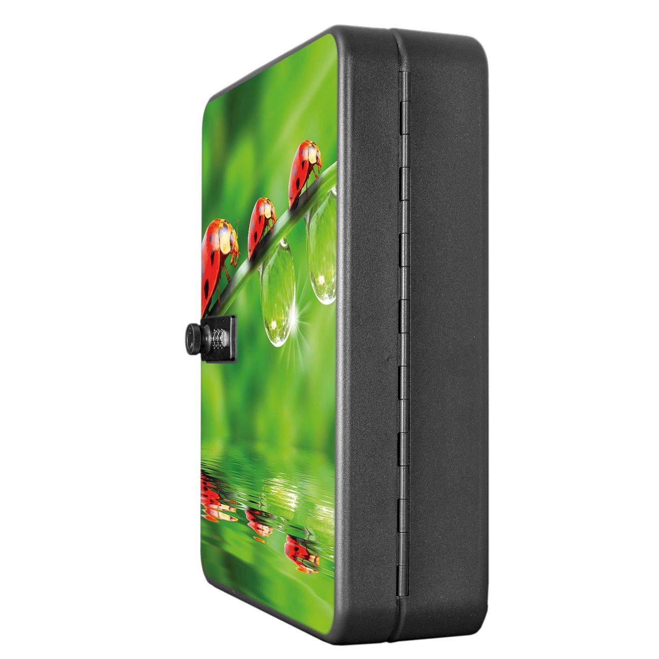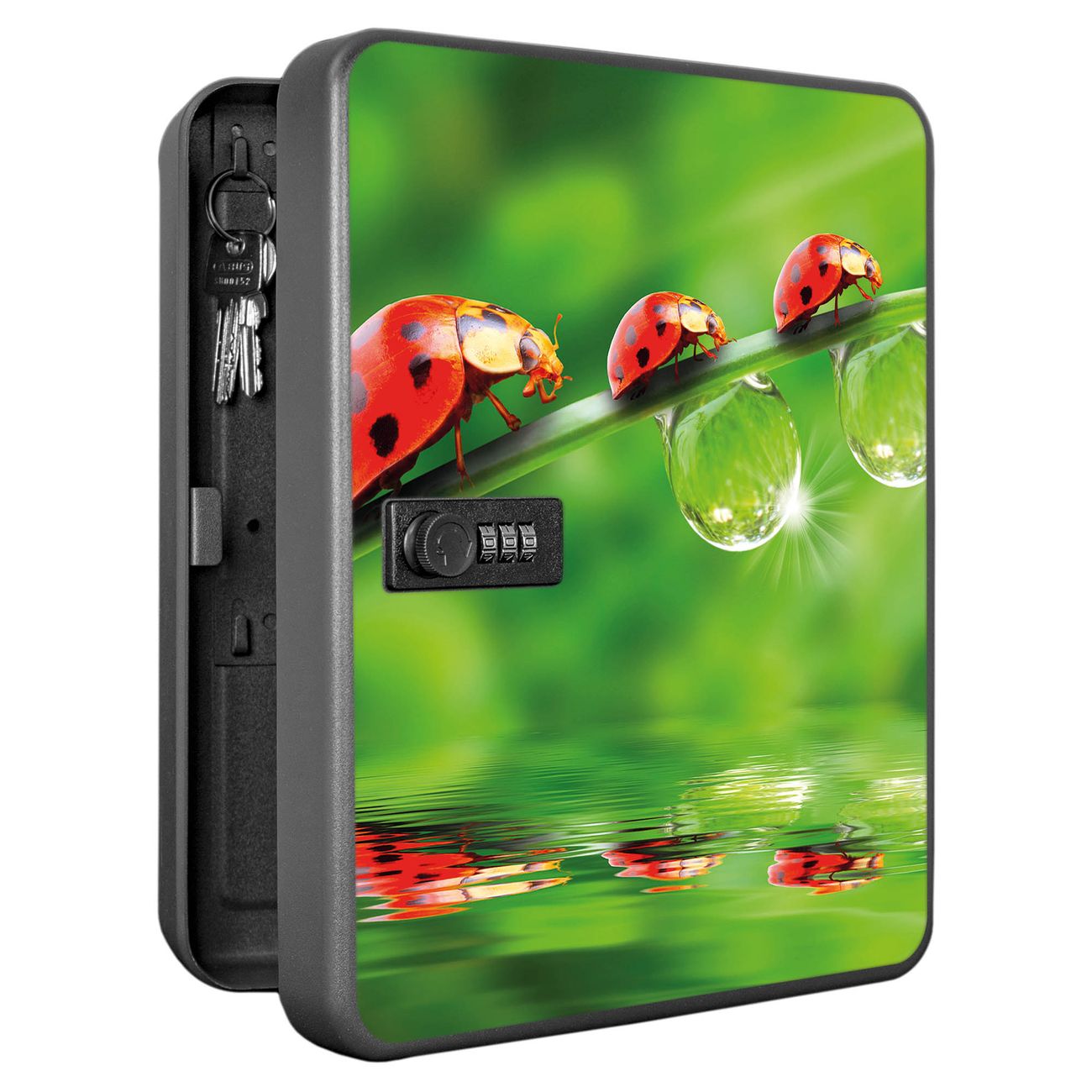 Der Schlüsselkasten ist gesamt 30x24x9,3cm groß und wiegt ca. 1500g. Die komplette Schlüsselaufbewahrung besteht aus schwarzem pulverbeschichtetem Stahl und wird von uns auf der Front mit einer Motivfolie kaschiert.