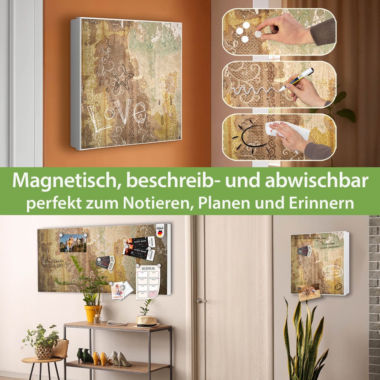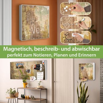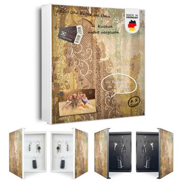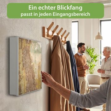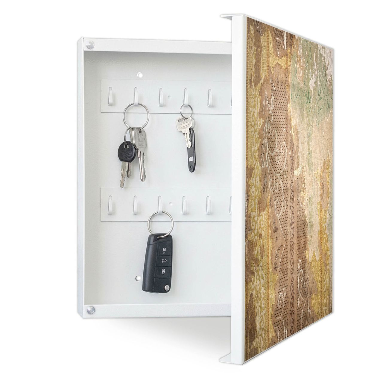 Bringe Ordnung und Eleganz in deinen Eingangsbereich mit dem banjado Schlüsselkasten Motiv Motiv Alte Tapeten. Die moderne Schlüsselbox kombiniert funktionales Design mit hochwertiger Verarbeitung und wird so zu einem echten Hingucker in Flur, Büro oder Ferienwohnung. ✅ Stilvolle Schlüsselaufbewahrung mit Motiv Motiv Alte Tapeten Der Design-Schlüsselkasten Motiv Motiv Alte Tapeten bietet Platz für bis zu 32 Schlüssel, die auf 4 stabilen Reihen mit je 8 Haken übersichtlich verstaut werden. Mit seinen kompakten Maßen von 30 x 30 x 5 cm passt die Schlüsselbox perfekt auch in kleinere Räume. Der weiß lackierte Stahlkorpus mit rechts angeschlagenem Türscharnier harmoniert mit gedruckten Folie auf der Front und fügt sich nahtlos in jedes Wohnambiente ein. Ob als Schlüsselorganizer für Zuhause oder als praktische Lösung für Büros, Praxen und Gewerbe, der banjado Schlüsselkasten sorgt für Ordnung und Übersicht. Dank der magnetischen, mit Kreidestiften beschreibbaren Folie auf der Front kannst du Notizen anheften oder Termine direkt auf der Oberfläche festhalten. Die Schlüsselbox Motiv Motiv Alte Tapeten zur Wandmontage wird inklusive Befestigungsmaterial geliefert und ist schnell angebracht. So hast du deine Schlüssel jederzeit griffbereit und zugleich stilvoll verstaut. Mit diesem banjado Schlüsselkasten Motiv Motiv Alte Tapeten kombinierst du praktische Aufbewahrung mit stilvollem Wohndesign. Ob privat oder geschäftlich, die Schlüsselbox sorgt für mehr Ordnung, Übersicht und ein wohnliches Ambiente.Vorteile im Überblick