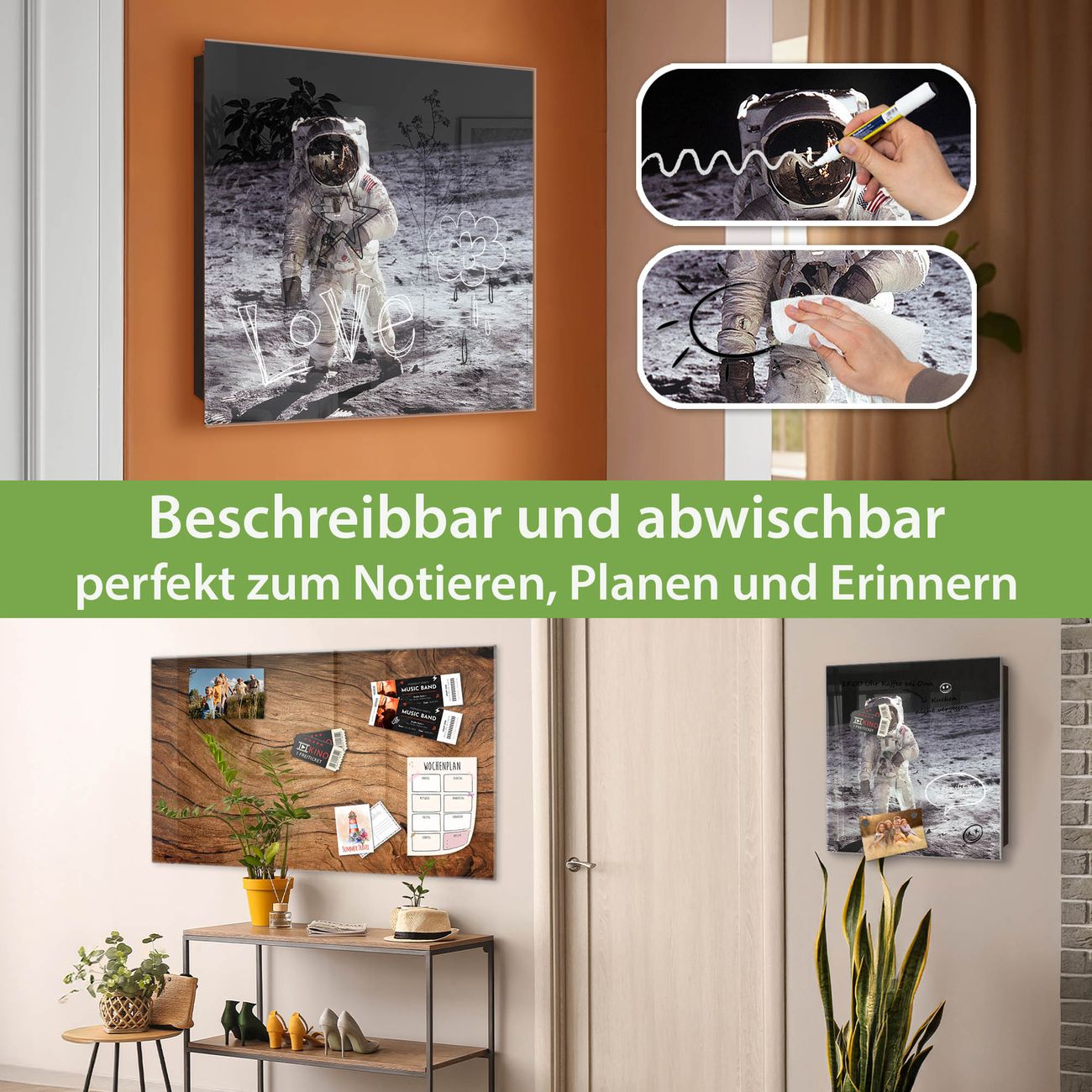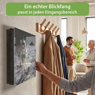Bringe Ordnung und Eleganz in deinen Eingangsbereich mit dem banjado Schlüsselkasten Motiv Motiv Astronaut. Die moderne Schlüsselbox kombiniert funktionales Design mit hochwertiger Verarbeitung und wird so zu einem echten Hingucker in Flur, Büro oder Ferienwohnung. ✅ Stilvolle Schlüsselaufbewahrung mit Glasfront im Motiv Motiv Astronaut Der Design-Schlüsselkasten Motiv Motiv Astronaut bietet Platz für bis zu 50 Schlüssel, die auf 5 stabilen Reihen mit je 10 Haken übersichtlich verstaut werden. Mit seinen kompakten Maßen von 30 x 30 x 5 cm passt die Schlüsselbox perfekt auch in kleinere Räume. Der schwarz lackierte Stahlkorpus mit rechts angeschlagenem Türscharnier harmoniert mit der Glasfront und fügt sich nahtlos in jedes Wohnambiente ein. Ob als Schlüsselorganizer für Zuhause oder als praktische Lösung für Büros, Praxen und Gewerbe, der banjado Schlüsselkasten sorgt für Ordnung und Übersicht. Dank der magnetischen, mit Kreidestiften beschreibbaren Glasfront kannst du Notizen anheften oder Termine direkt auf der Oberfläche festhalten. Die Schlüsselbox Motiv Motiv Astronaut zur Wandmontage wird inklusive Befestigungsmaterial geliefert und ist schnell angebracht. So hast du deine Schlüssel jederzeit griffbereit und zugleich stilvoll verstaut. Mit diesem banjado Schlüsselkasten Motiv Motiv Astronaut kombinierst du praktische Aufbewahrung mit stilvollem Wohndesign. Ob privat oder geschäftlich, die Schlüsselbox sorgt für mehr Ordnung, Übersicht und ein wohnliches Ambiente.Vorteile im Überblick
