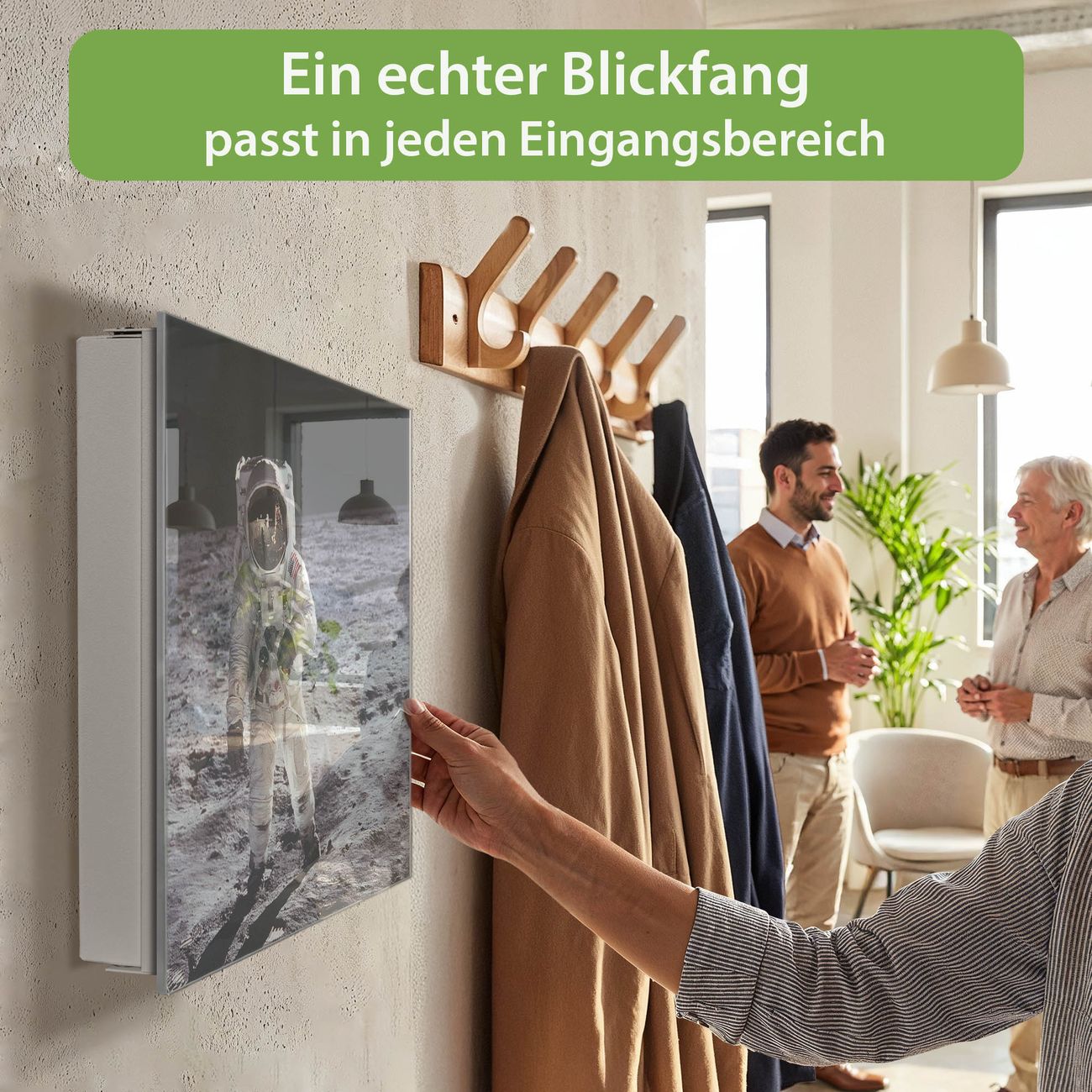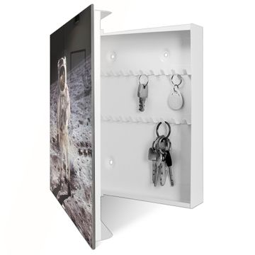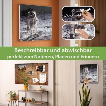 Bringe Ordnung und Eleganz in deinen Eingangsbereich mit dem banjado Schlüsselkasten Motiv Motiv Astronaut. Die moderne Schlüsselbox kombiniert funktionales Design mit hochwertiger Verarbeitung und wird so zu einem echten Hingucker in Flur, Büro oder Ferienwohnung. ✅ Stilvolle Schlüsselaufbewahrung mit Glasfront im Motiv Motiv Astronaut Der Design-Schlüsselkasten Motiv Motiv Astronaut bietet Platz für bis zu 50 Schlüssel, die auf 5 stabilen Reihen mit je 10 Haken übersichtlich verstaut werden. Mit seinen kompakten Maßen von 30 x 30 x 5 cm passt die Schlüsselbox perfekt auch in kleinere Räume. Der weiß lackierte Stahlkorpus mit rechts angeschlagenem Türscharnier harmoniert mit der Glasfront und fügt sich nahtlos in jedes Wohnambiente ein. Ob als Schlüsselorganizer für Zuhause oder als praktische Lösung für Büros, Praxen und Gewerbe, der banjado Schlüsselkasten sorgt für Ordnung und Übersicht. Dank der magnetischen, mit Kreidestiften beschreibbaren Glasfront kannst du Notizen anheften oder Termine direkt auf der Oberfläche festhalten. Die Schlüsselbox Motiv Motiv Astronaut zur Wandmontage wird inklusive Befestigungsmaterial geliefert und ist schnell angebracht. So hast du deine Schlüssel jederzeit griffbereit und zugleich stilvoll verstaut. Mit diesem banjado Schlüsselkasten Motiv Motiv Astronaut kombinierst du praktische Aufbewahrung mit stilvollem Wohndesign. Ob privat oder geschäftlich, die Schlüsselbox sorgt für mehr Ordnung, Übersicht und ein wohnliches Ambiente.Vorteile im Überblick