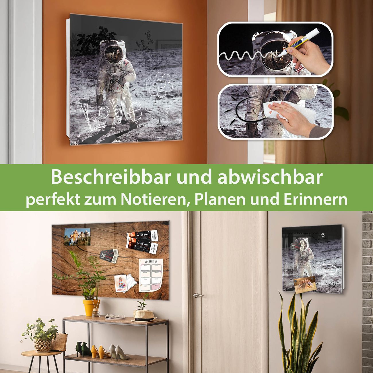 ✅ Magnetisch und mit Kreidestift beschreibbar, gehärtetes Glas, links angeschlagene TürOrdnung und Design in einem