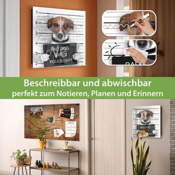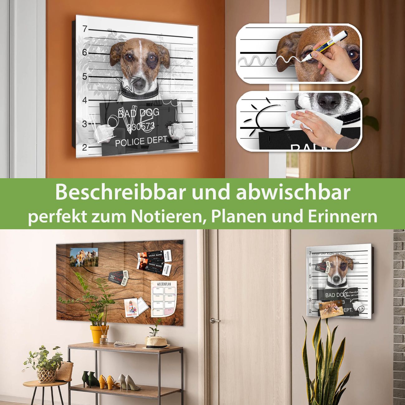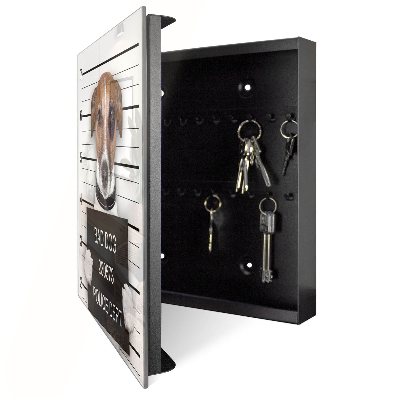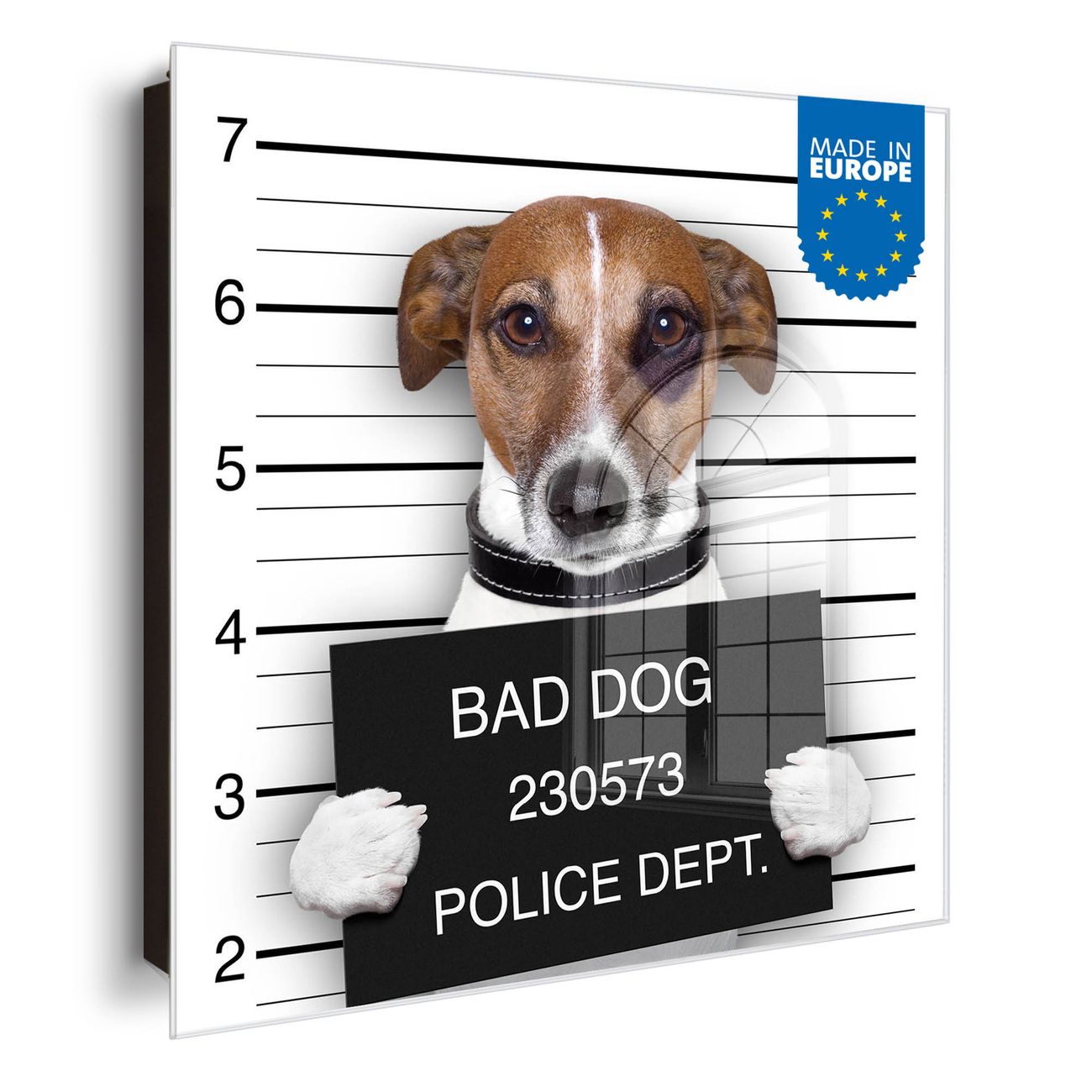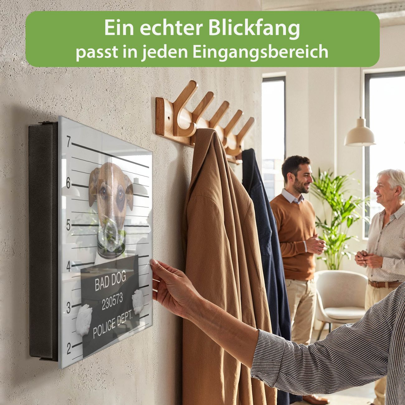 Bringe Ordnung und Eleganz in deinen Eingangsbereich mit dem banjado Schlüsselkasten Motiv Motiv Bad Dog Jack Russel. Die moderne Schlüsselbox kombiniert funktionales Design mit hochwertiger Verarbeitung und wird so zu einem echten Hingucker in Flur, Büro oder Ferienwohnung. ✅ Stilvolle Schlüsselaufbewahrung mit Glasfront im Motiv Motiv Bad Dog Jack Russel Der Design-Schlüsselkasten Motiv Motiv Bad Dog Jack Russel bietet Platz für bis zu 50 Schlüssel, die auf 5 stabilen Reihen mit je 10 Haken übersichtlich verstaut werden. Mit seinen kompakten Maßen von 30 x 30 x 5 cm passt die Schlüsselbox perfekt auch in kleinere Räume. Der schwarz lackierte Stahlkorpus mit rechts angeschlagenem Türscharnier harmoniert mit der Glasfront und fügt sich nahtlos in jedes Wohnambiente ein. Ob als Schlüsselorganizer für Zuhause oder als praktische Lösung für Büros, Praxen und Gewerbe, der banjado Schlüsselkasten sorgt für Ordnung und Übersicht. Dank der magnetischen, mit Kreidestiften beschreibbaren Glasfront kannst du Notizen anheften oder Termine direkt auf der Oberfläche festhalten. Die Schlüsselbox Motiv Motiv Bad Dog Jack Russel zur Wandmontage wird inklusive Befestigungsmaterial geliefert und ist schnell angebracht. So hast du deine Schlüssel jederzeit griffbereit und zugleich stilvoll verstaut. Mit diesem banjado Schlüsselkasten Motiv Motiv Bad Dog Jack Russel kombinierst du praktische Aufbewahrung mit stilvollem Wohndesign. Ob privat oder geschäftlich, die Schlüsselbox sorgt für mehr Ordnung, Übersicht und ein wohnliches Ambiente.Vorteile im Überblick