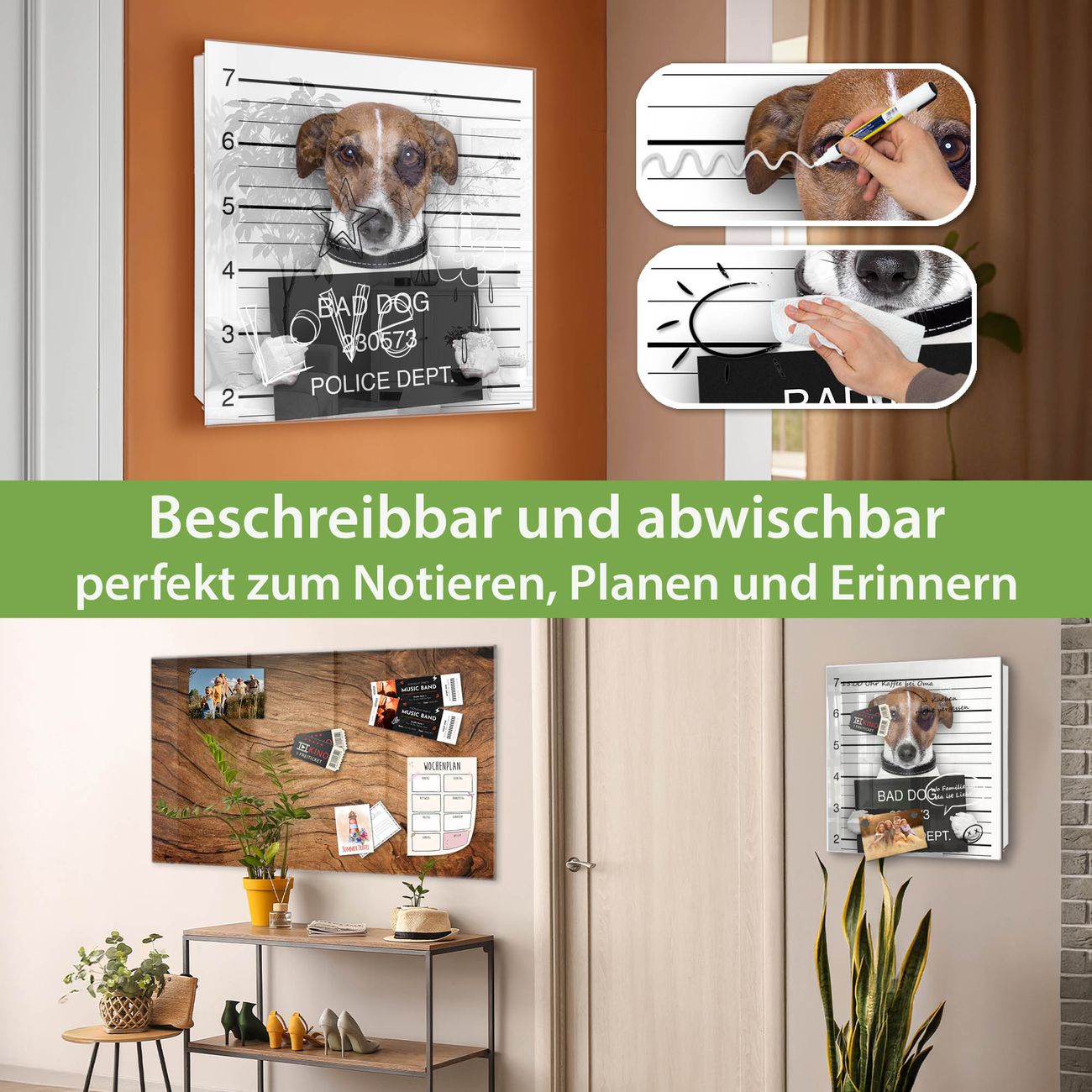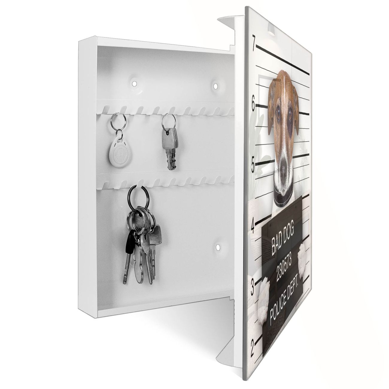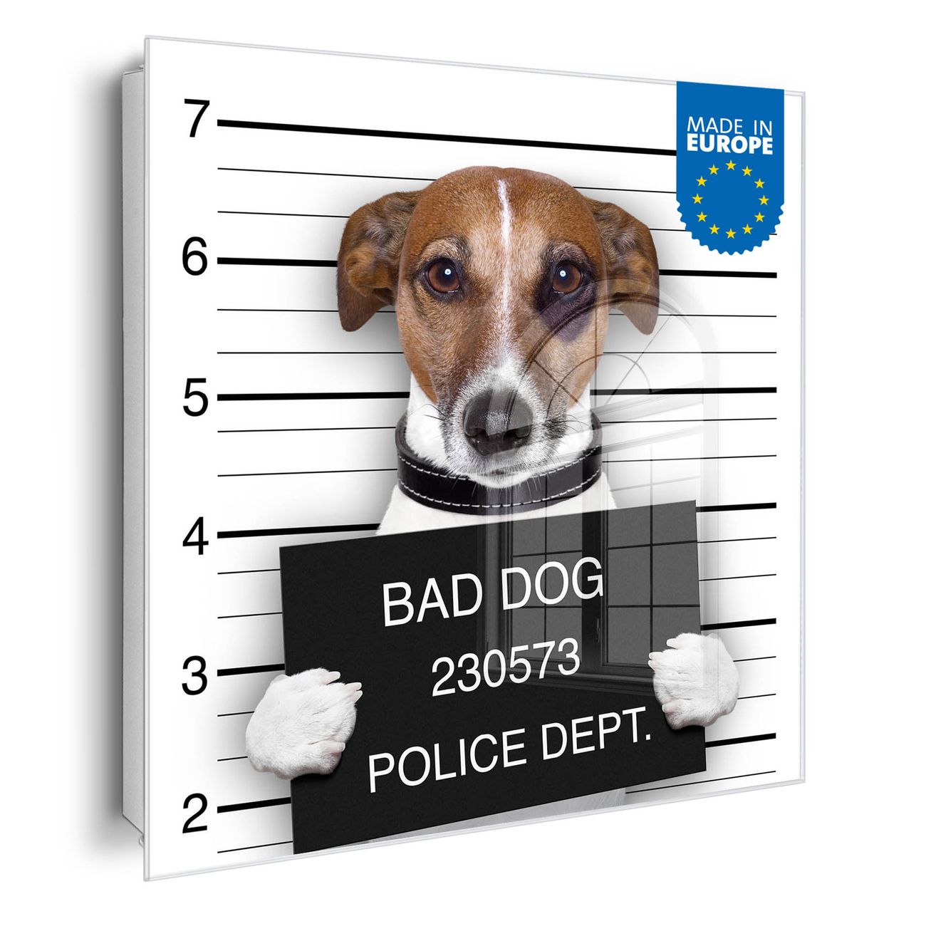 Bringe Ordnung und Eleganz in deinen Eingangsbereich mit dem banjado Schlüsselkasten Motiv Motiv Bad Dog Jack Russel. Die moderne Schlüsselbox kombiniert funktionales Design mit hochwertiger Verarbeitung und wird so zu einem echten Hingucker in Flur, Büro oder Ferienwohnung. ✅ Stilvolle Schlüsselaufbewahrung mit Glasfront im Motiv Motiv Bad Dog Jack Russel Der Design-Schlüsselkasten Motiv Motiv Bad Dog Jack Russel bietet Platz für bis zu 50 Schlüssel, die auf 5 stabilen Reihen mit je 10 Haken übersichtlich verstaut werden. Mit seinen kompakten Maßen von 30 x 30 x 5 cm passt die Schlüsselbox perfekt auch in kleinere Räume. Der weiß lackierte Stahlkorpus mit rechts angeschlagenem Türscharnier harmoniert mit der Glasfront und fügt sich nahtlos in jedes Wohnambiente ein. Ob als Schlüsselorganizer für Zuhause oder als praktische Lösung für Büros, Praxen und Gewerbe, der banjado Schlüsselkasten sorgt für Ordnung und Übersicht. Dank der magnetischen, mit Kreidestiften beschreibbaren Glasfront kannst du Notizen anheften oder Termine direkt auf der Oberfläche festhalten. Die Schlüsselbox Motiv Motiv Bad Dog Jack Russel zur Wandmontage wird inklusive Befestigungsmaterial geliefert und ist schnell angebracht. So hast du deine Schlüssel jederzeit griffbereit und zugleich stilvoll verstaut. Mit diesem banjado Schlüsselkasten Motiv Motiv Bad Dog Jack Russel kombinierst du praktische Aufbewahrung mit stilvollem Wohndesign. Ob privat oder geschäftlich, die Schlüsselbox sorgt für mehr Ordnung, Übersicht und ein wohnliches Ambiente.Vorteile im Überblick