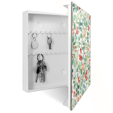 Bringe Ordnung und Eleganz in deinen Eingangsbereich mit dem banjado Schlüsselkasten Motiv Motiv Beeren und Blätter. Die moderne Schlüsselbox kombiniert funktionales Design mit hochwertiger Verarbeitung und wird so zu einem echten Hingucker in Flur, Büro oder Ferienwohnung. ✅ Stilvolle Schlüsselaufbewahrung mit Glasfront im Motiv Motiv Beeren und Blätter Der Design-Schlüsselkasten Motiv Motiv Beeren und Blätter bietet Platz für bis zu 50 Schlüssel, die auf 5 stabilen Reihen mit je 10 Haken übersichtlich verstaut werden. Mit seinen kompakten Maßen von 30 x 30 x 5 cm passt die Schlüsselbox perfekt auch in kleinere Räume. Der weiß lackierte Stahlkorpus mit rechts angeschlagenem Türscharnier harmoniert mit der Glasfront und fügt sich nahtlos in jedes Wohnambiente ein. Ob als Schlüsselorganizer für Zuhause oder als praktische Lösung für Büros, Praxen und Gewerbe, der banjado Schlüsselkasten sorgt für Ordnung und Übersicht. Dank der magnetischen, mit Kreidestiften beschreibbaren Glasfront kannst du Notizen anheften oder Termine direkt auf der Oberfläche festhalten. Die Schlüsselbox Motiv Motiv Beeren und Blätter zur Wandmontage wird inklusive Befestigungsmaterial geliefert und ist schnell angebracht. So hast du deine Schlüssel jederzeit griffbereit und zugleich stilvoll verstaut. Mit diesem banjado Schlüsselkasten Motiv Motiv Beeren und Blätter kombinierst du praktische Aufbewahrung mit stilvollem Wohndesign. Ob privat oder geschäftlich, die Schlüsselbox sorgt für mehr Ordnung, Übersicht und ein wohnliches Ambiente.Vorteile im Überblick