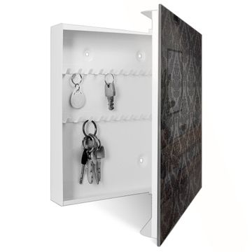 Bringe Ordnung und Eleganz in deinen Eingangsbereich mit dem banjado Schlüsselkasten Motiv Motiv Black Deluxe. Die moderne Schlüsselbox kombiniert funktionales Design mit hochwertiger Verarbeitung und wird so zu einem echten Hingucker in Flur, Büro oder Ferienwohnung. ✅ Stilvolle Schlüsselaufbewahrung mit Glasfront im Motiv Motiv Black Deluxe Der Design-Schlüsselkasten Motiv Motiv Black Deluxe bietet Platz für bis zu 50 Schlüssel, die auf 5 stabilen Reihen mit je 10 Haken übersichtlich verstaut werden. Mit seinen kompakten Maßen von 30 x 30 x 5 cm passt die Schlüsselbox perfekt auch in kleinere Räume. Der weiß lackierte Stahlkorpus mit rechts angeschlagenem Türscharnier harmoniert mit der Glasfront und fügt sich nahtlos in jedes Wohnambiente ein. Ob als Schlüsselorganizer für Zuhause oder als praktische Lösung für Büros, Praxen und Gewerbe, der banjado Schlüsselkasten sorgt für Ordnung und Übersicht. Dank der magnetischen, mit Kreidestiften beschreibbaren Glasfront kannst du Notizen anheften oder Termine direkt auf der Oberfläche festhalten. Die Schlüsselbox Motiv Motiv Black Deluxe zur Wandmontage wird inklusive Befestigungsmaterial geliefert und ist schnell angebracht. So hast du deine Schlüssel jederzeit griffbereit und zugleich stilvoll verstaut. Mit diesem banjado Schlüsselkasten Motiv Motiv Black Deluxe kombinierst du praktische Aufbewahrung mit stilvollem Wohndesign. Ob privat oder geschäftlich, die Schlüsselbox sorgt für mehr Ordnung, Übersicht und ein wohnliches Ambiente.Vorteile im Überblick