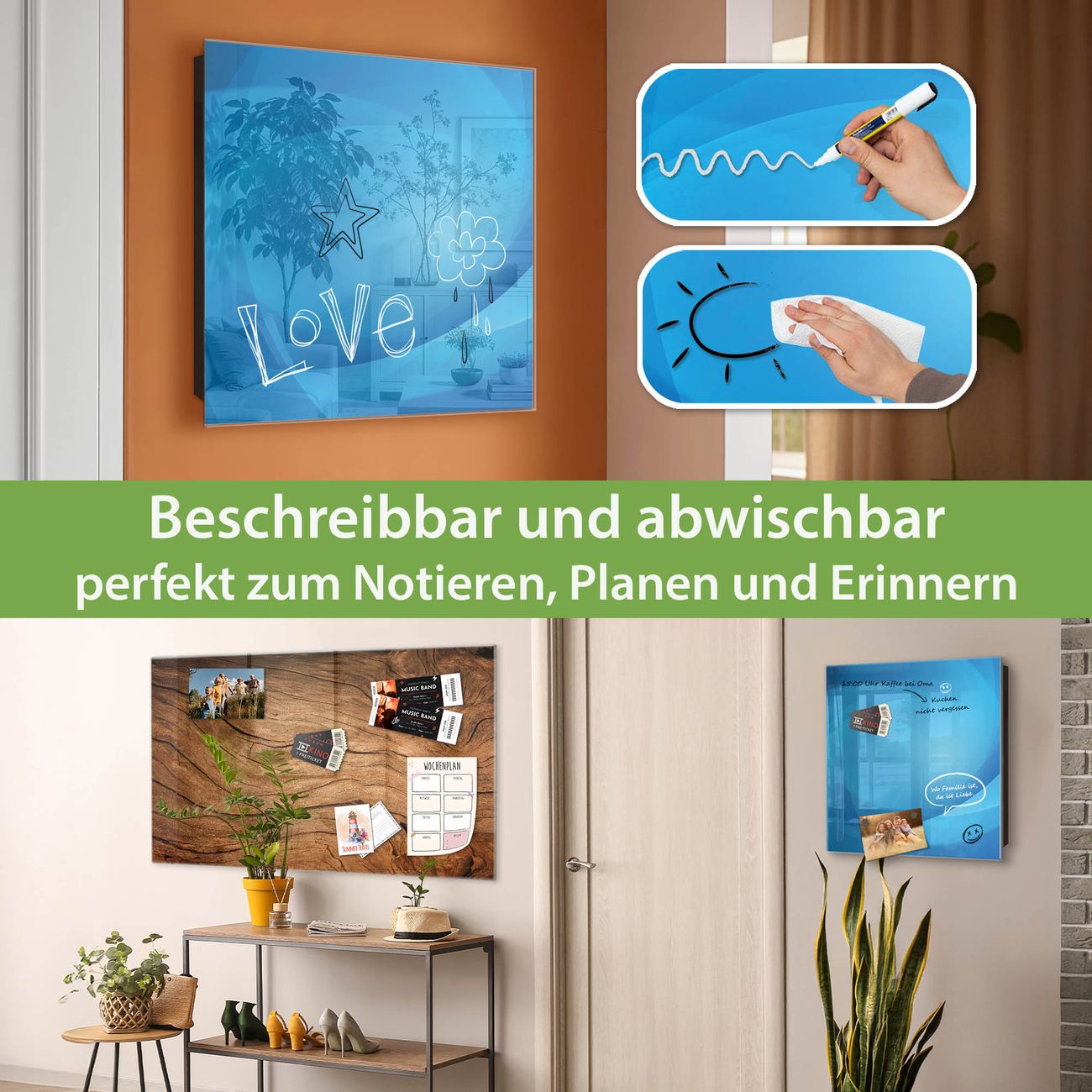 ✅ Magnetisch und mit Kreidestift beschreibbar, gehärtetes Glas, links angeschlagene TürOrdnung und Design in einem
