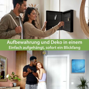 Bringe Ordnung und Eleganz in deinen Eingangsbereich mit dem banjado Schlüsselkasten Motiv Motiv Blaues Licht. Die moderne Schlüsselbox kombiniert funktionales Design mit hochwertiger Verarbeitung und wird so zu einem echten Hingucker in Flur, Büro oder Ferienwohnung. ✅ Stilvolle Schlüsselaufbewahrung mit Glasfront im Motiv Motiv Blaues Licht Der Design-Schlüsselkasten Motiv Motiv Blaues Licht bietet Platz für bis zu 50 Schlüssel, die auf 5 stabilen Reihen mit je 10 Haken übersichtlich verstaut werden. Mit seinen kompakten Maßen von 30 x 30 x 5 cm passt die Schlüsselbox perfekt auch in kleinere Räume. Der schwarz lackierte Stahlkorpus mit rechts angeschlagenem Türscharnier harmoniert mit der Glasfront und fügt sich nahtlos in jedes Wohnambiente ein. Ob als Schlüsselorganizer für Zuhause oder als praktische Lösung für Büros, Praxen und Gewerbe, der banjado Schlüsselkasten sorgt für Ordnung und Übersicht. Dank der magnetischen, mit Kreidestiften beschreibbaren Glasfront kannst du Notizen anheften oder Termine direkt auf der Oberfläche festhalten. Die Schlüsselbox Motiv Motiv Blaues Licht zur Wandmontage wird inklusive Befestigungsmaterial geliefert und ist schnell angebracht. So hast du deine Schlüssel jederzeit griffbereit und zugleich stilvoll verstaut. Mit diesem banjado Schlüsselkasten Motiv Motiv Blaues Licht kombinierst du praktische Aufbewahrung mit stilvollem Wohndesign. Ob privat oder geschäftlich, die Schlüsselbox sorgt für mehr Ordnung, Übersicht und ein wohnliches Ambiente.Vorteile im Überblick