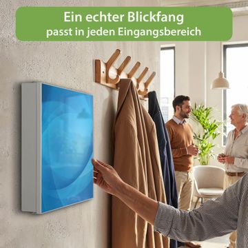 Bringe Ordnung und Eleganz in deinen Eingangsbereich mit dem banjado Schlüsselkasten Motiv Motiv Blaues Licht. Die moderne Schlüsselbox kombiniert funktionales Design mit hochwertiger Verarbeitung und wird so zu einem echten Hingucker in Flur, Büro oder Ferienwohnung. ✅ Stilvolle Schlüsselaufbewahrung mit Motiv Motiv Blaues Licht Der Design-Schlüsselkasten Motiv Motiv Blaues Licht bietet Platz für bis zu 32 Schlüssel, die auf 4 stabilen Reihen mit je 8 Haken übersichtlich verstaut werden. Mit seinen kompakten Maßen von 30 x 30 x 5 cm passt die Schlüsselbox perfekt auch in kleinere Räume. Der weiß lackierte Stahlkorpus mit rechts angeschlagenem Türscharnier harmoniert mit gedruckten Folie auf der Front und fügt sich nahtlos in jedes Wohnambiente ein. Ob als Schlüsselorganizer für Zuhause oder als praktische Lösung für Büros, Praxen und Gewerbe, der banjado Schlüsselkasten sorgt für Ordnung und Übersicht. Dank der magnetischen, mit Kreidestiften beschreibbaren Folie auf der Front kannst du Notizen anheften oder Termine direkt auf der Oberfläche festhalten. Die Schlüsselbox Motiv Motiv Blaues Licht zur Wandmontage wird inklusive Befestigungsmaterial geliefert und ist schnell angebracht. So hast du deine Schlüssel jederzeit griffbereit und zugleich stilvoll verstaut. Mit diesem banjado Schlüsselkasten Motiv Motiv Blaues Licht kombinierst du praktische Aufbewahrung mit stilvollem Wohndesign. Ob privat oder geschäftlich, die Schlüsselbox sorgt für mehr Ordnung, Übersicht und ein wohnliches Ambiente.Vorteile im Überblick