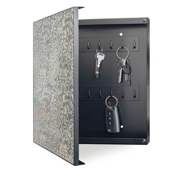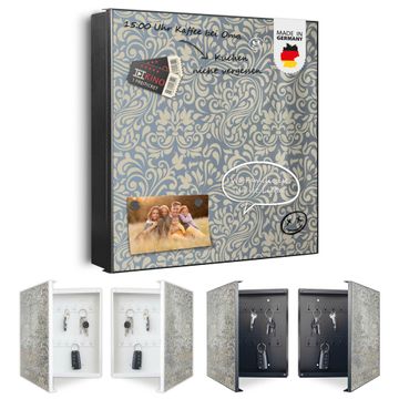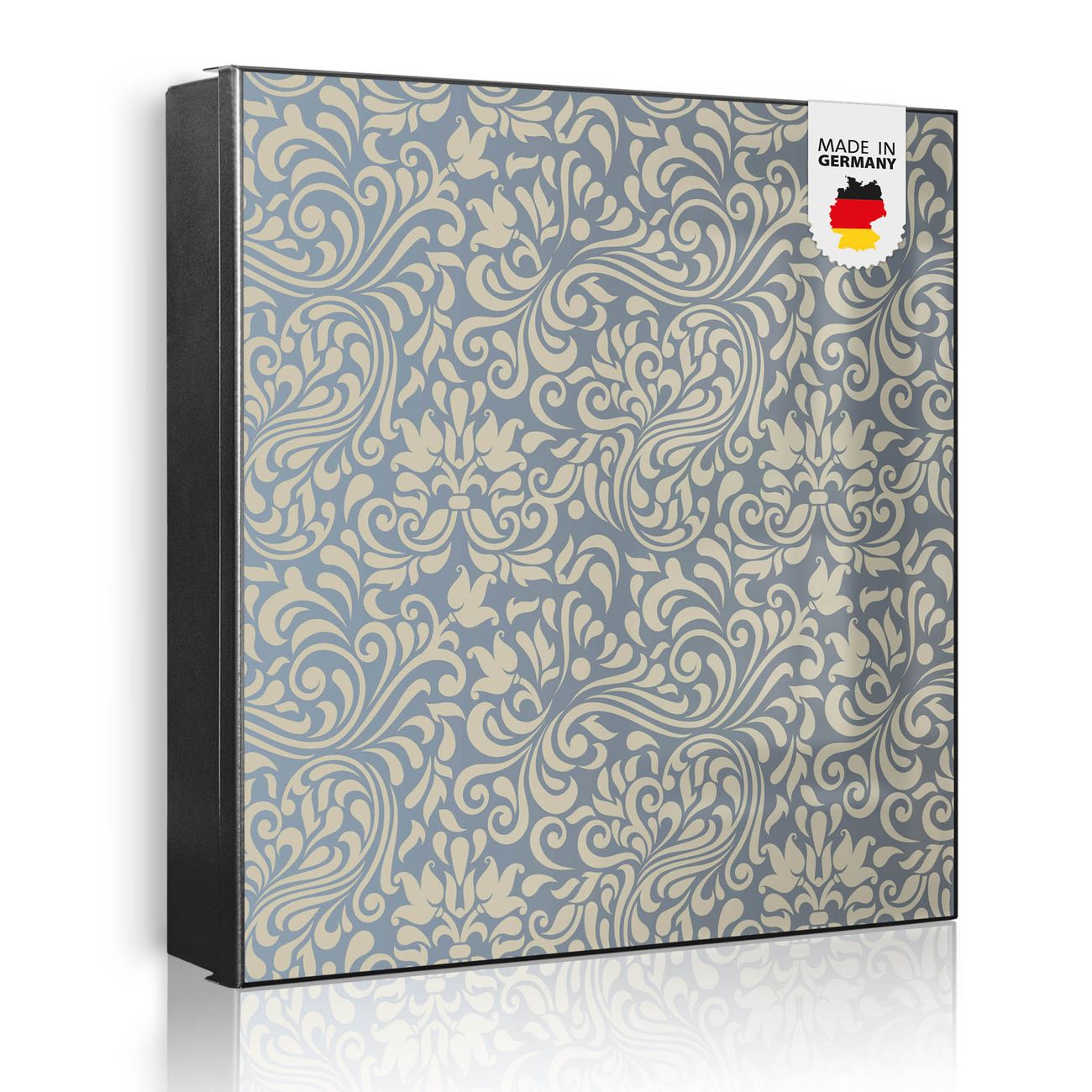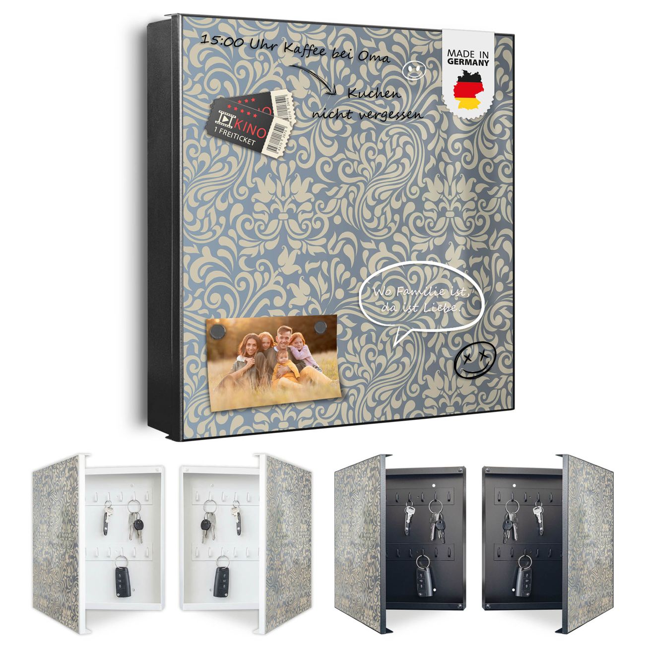 Bringe Ordnung und Eleganz in deinen Eingangsbereich mit dem banjado Schlüsselkasten Motiv Motiv Blaues Ornament. Die moderne Schlüsselbox kombiniert funktionales Design mit hochwertiger Verarbeitung und wird so zu einem echten Hingucker in Flur, Büro oder Ferienwohnung. ✅ Stilvolle Schlüsselaufbewahrung mit Motiv Motiv Blaues Ornament Der Design-Schlüsselkasten Motiv Motiv Blaues Ornament bietet Platz für bis zu 32 Schlüssel, die auf 4 stabilen Reihen mit je 8 Haken übersichtlich verstaut werden. Mit seinen kompakten Maßen von 30 x 30 x 5 cm passt die Schlüsselbox perfekt auch in kleinere Räume. Der schwarz lackierte Stahlkorpus mit links angeschlagenem Türscharnier harmoniert mit gedruckten Folie auf der Front und fügt sich nahtlos in jedes Wohnambiente ein. Ob als Schlüsselorganizer für Zuhause oder als praktische Lösung für Büros, Praxen und Gewerbe, der banjado Schlüsselkasten sorgt für Ordnung und Übersicht. Dank der magnetischen, mit Kreidestiften beschreibbaren Folie auf der Front kannst du Notizen anheften oder Termine direkt auf der Oberfläche festhalten. Die Schlüsselbox Motiv Motiv Blaues Ornament zur Wandmontage wird inklusive Befestigungsmaterial geliefert und ist schnell angebracht. So hast du deine Schlüssel jederzeit griffbereit und zugleich stilvoll verstaut. Mit diesem banjado Schlüsselkasten Motiv Motiv Blaues Ornament kombinierst du praktische Aufbewahrung mit stilvollem Wohndesign. Ob privat oder geschäftlich, die Schlüsselbox sorgt für mehr Ordnung, Übersicht und ein wohnliches Ambiente.Vorteile im Überblick