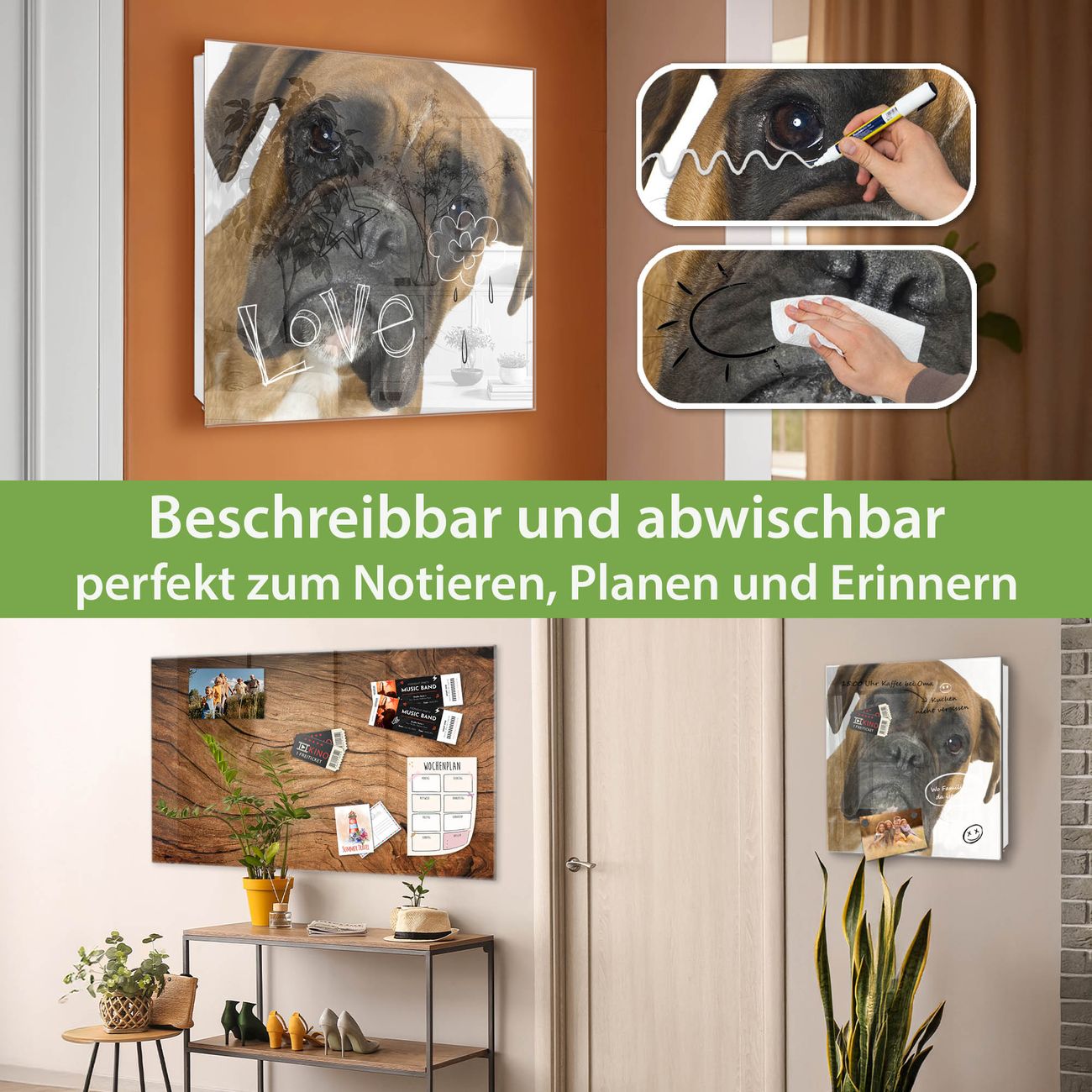 ✅ Magnetisch und mit Kreidestift beschreibbar, gehärtetes Glas, rechts angeschlagene TürOrdnung und Design in einem