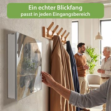 Bringe Ordnung und Eleganz in deinen Eingangsbereich mit dem banjado Schlüsselkasten Motiv Motiv Boxer. Die moderne Schlüsselbox kombiniert funktionales Design mit hochwertiger Verarbeitung und wird so zu einem echten Hingucker in Flur, Büro oder Ferienwohnung. ✅ Stilvolle Schlüsselaufbewahrung mit Glasfront im Motiv Motiv Boxer Der Design-Schlüsselkasten Motiv Motiv Boxer bietet Platz für bis zu 50 Schlüssel, die auf 5 stabilen Reihen mit je 10 Haken übersichtlich verstaut werden. Mit seinen kompakten Maßen von 30 x 30 x 5 cm passt die Schlüsselbox perfekt auch in kleinere Räume. Der weiß lackierte Stahlkorpus mit rechts angeschlagenem Türscharnier harmoniert mit der Glasfront und fügt sich nahtlos in jedes Wohnambiente ein. Ob als Schlüsselorganizer für Zuhause oder als praktische Lösung für Büros, Praxen und Gewerbe, der banjado Schlüsselkasten sorgt für Ordnung und Übersicht. Dank der magnetischen, mit Kreidestiften beschreibbaren Glasfront kannst du Notizen anheften oder Termine direkt auf der Oberfläche festhalten. Die Schlüsselbox Motiv Motiv Boxer zur Wandmontage wird inklusive Befestigungsmaterial geliefert und ist schnell angebracht. So hast du deine Schlüssel jederzeit griffbereit und zugleich stilvoll verstaut. Mit diesem banjado Schlüsselkasten Motiv Motiv Boxer kombinierst du praktische Aufbewahrung mit stilvollem Wohndesign. Ob privat oder geschäftlich, die Schlüsselbox sorgt für mehr Ordnung, Übersicht und ein wohnliches Ambiente.Vorteile im Überblick