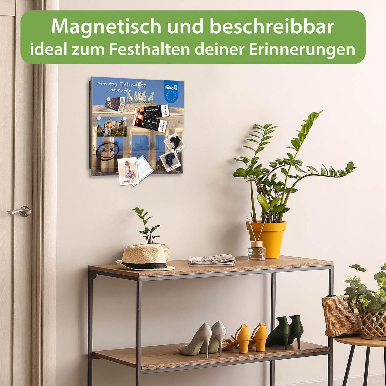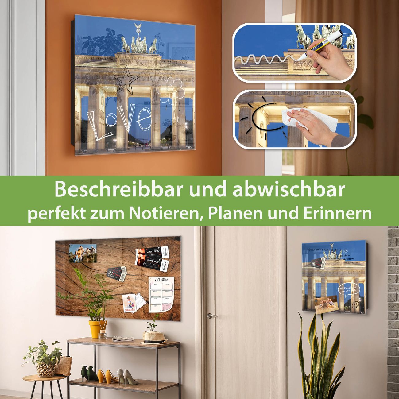 Bringe Ordnung und Eleganz in deinen Eingangsbereich mit dem banjado Schlüsselkasten Motiv Motiv Brandenburger Tor 2. Die moderne Schlüsselbox kombiniert funktionales Design mit hochwertiger Verarbeitung und wird so zu einem echten Hingucker in Flur, Büro oder Ferienwohnung. ✅ Stilvolle Schlüsselaufbewahrung mit Glasfront im Motiv Motiv Brandenburger Tor 2 Der Design-Schlüsselkasten Motiv Motiv Brandenburger Tor 2 bietet Platz für bis zu 50 Schlüssel, die auf 5 stabilen Reihen mit je 10 Haken übersichtlich verstaut werden. Mit seinen kompakten Maßen von 30 x 30 x 5 cm passt die Schlüsselbox perfekt auch in kleinere Räume. Der schwarz lackierte Stahlkorpus mit rechts angeschlagenem Türscharnier harmoniert mit der Glasfront und fügt sich nahtlos in jedes Wohnambiente ein. Ob als Schlüsselorganizer für Zuhause oder als praktische Lösung für Büros, Praxen und Gewerbe, der banjado Schlüsselkasten sorgt für Ordnung und Übersicht. Dank der magnetischen, mit Kreidestiften beschreibbaren Glasfront kannst du Notizen anheften oder Termine direkt auf der Oberfläche festhalten. Die Schlüsselbox Motiv Motiv Brandenburger Tor 2 zur Wandmontage wird inklusive Befestigungsmaterial geliefert und ist schnell angebracht. So hast du deine Schlüssel jederzeit griffbereit und zugleich stilvoll verstaut. Mit diesem banjado Schlüsselkasten Motiv Motiv Brandenburger Tor 2 kombinierst du praktische Aufbewahrung mit stilvollem Wohndesign. Ob privat oder geschäftlich, die Schlüsselbox sorgt für mehr Ordnung, Übersicht und ein wohnliches Ambiente.Vorteile im Überblick