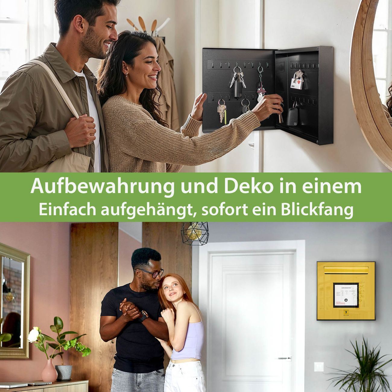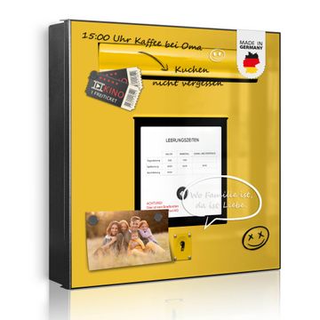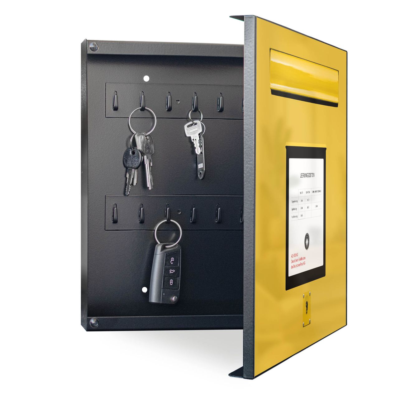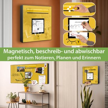 Bringe Ordnung und Eleganz in deinen Eingangsbereich mit dem banjado Schlüsselkasten Motiv Motiv Briefkasten Gelb. Die moderne Schlüsselbox kombiniert funktionales Design mit hochwertiger Verarbeitung und wird so zu einem echten Hingucker in Flur, Büro oder Ferienwohnung. ✅ Stilvolle Schlüsselaufbewahrung mit Motiv Motiv Briefkasten Gelb Der Design-Schlüsselkasten Motiv Motiv Briefkasten Gelb bietet Platz für bis zu 32 Schlüssel, die auf 4 stabilen Reihen mit je 8 Haken übersichtlich verstaut werden. Mit seinen kompakten Maßen von 30 x 30 x 5 cm passt die Schlüsselbox perfekt auch in kleinere Räume. Der schwarz lackierte Stahlkorpus mit rechts angeschlagenem Türscharnier harmoniert mit gedruckten Folie auf der Front und fügt sich nahtlos in jedes Wohnambiente ein. Ob als Schlüsselorganizer für Zuhause oder als praktische Lösung für Büros, Praxen und Gewerbe, der banjado Schlüsselkasten sorgt für Ordnung und Übersicht. Dank der magnetischen, mit Kreidestiften beschreibbaren Folie auf der Front kannst du Notizen anheften oder Termine direkt auf der Oberfläche festhalten. Die Schlüsselbox Motiv Motiv Briefkasten Gelb zur Wandmontage wird inklusive Befestigungsmaterial geliefert und ist schnell angebracht. So hast du deine Schlüssel jederzeit griffbereit und zugleich stilvoll verstaut. Mit diesem banjado Schlüsselkasten Motiv Motiv Briefkasten Gelb kombinierst du praktische Aufbewahrung mit stilvollem Wohndesign. Ob privat oder geschäftlich, die Schlüsselbox sorgt für mehr Ordnung, Übersicht und ein wohnliches Ambiente.Vorteile im Überblick