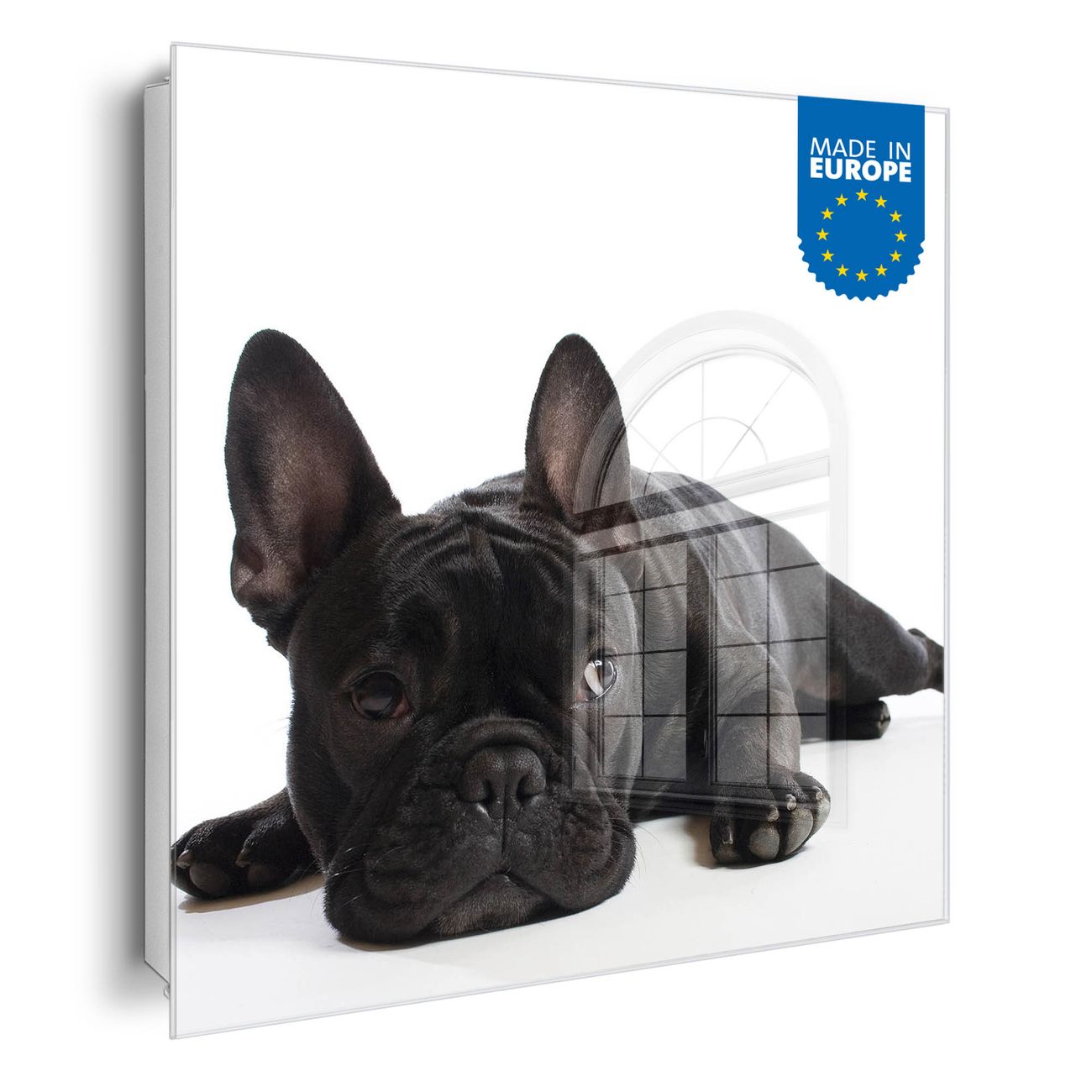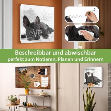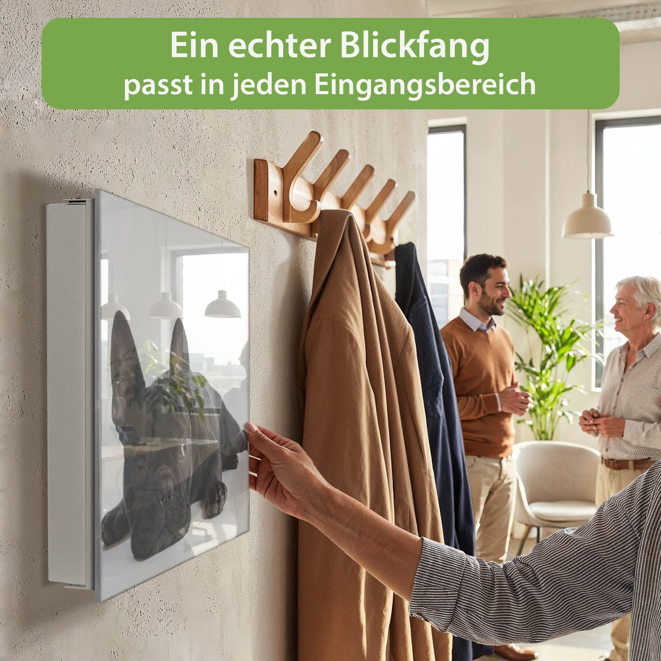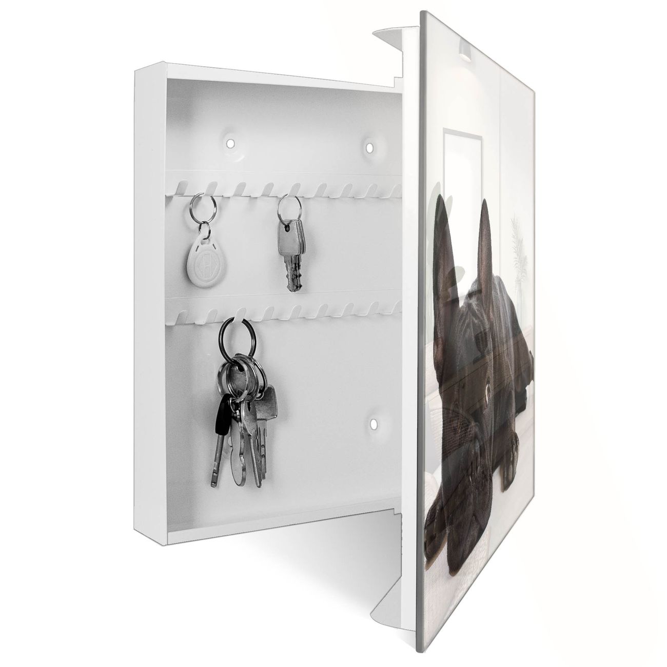Bringe Ordnung und Eleganz in deinen Eingangsbereich mit dem banjado Schlüsselkasten Motiv Motiv Bulldogge. Die moderne Schlüsselbox kombiniert funktionales Design mit hochwertiger Verarbeitung und wird so zu einem echten Hingucker in Flur, Büro oder Ferienwohnung. ✅ Stilvolle Schlüsselaufbewahrung mit Glasfront im Motiv Motiv Bulldogge Der Design-Schlüsselkasten Motiv Motiv Bulldogge bietet Platz für bis zu 50 Schlüssel, die auf 5 stabilen Reihen mit je 10 Haken übersichtlich verstaut werden. Mit seinen kompakten Maßen von 30 x 30 x 5 cm passt die Schlüsselbox perfekt auch in kleinere Räume. Der weiß lackierte Stahlkorpus mit rechts angeschlagenem Türscharnier harmoniert mit der Glasfront und fügt sich nahtlos in jedes Wohnambiente ein. Ob als Schlüsselorganizer für Zuhause oder als praktische Lösung für Büros, Praxen und Gewerbe, der banjado Schlüsselkasten sorgt für Ordnung und Übersicht. Dank der magnetischen, mit Kreidestiften beschreibbaren Glasfront kannst du Notizen anheften oder Termine direkt auf der Oberfläche festhalten. Die Schlüsselbox Motiv Motiv Bulldogge zur Wandmontage wird inklusive Befestigungsmaterial geliefert und ist schnell angebracht. So hast du deine Schlüssel jederzeit griffbereit und zugleich stilvoll verstaut. Mit diesem banjado Schlüsselkasten Motiv Motiv Bulldogge kombinierst du praktische Aufbewahrung mit stilvollem Wohndesign. Ob privat oder geschäftlich, die Schlüsselbox sorgt für mehr Ordnung, Übersicht und ein wohnliches Ambiente.Vorteile im Überblick