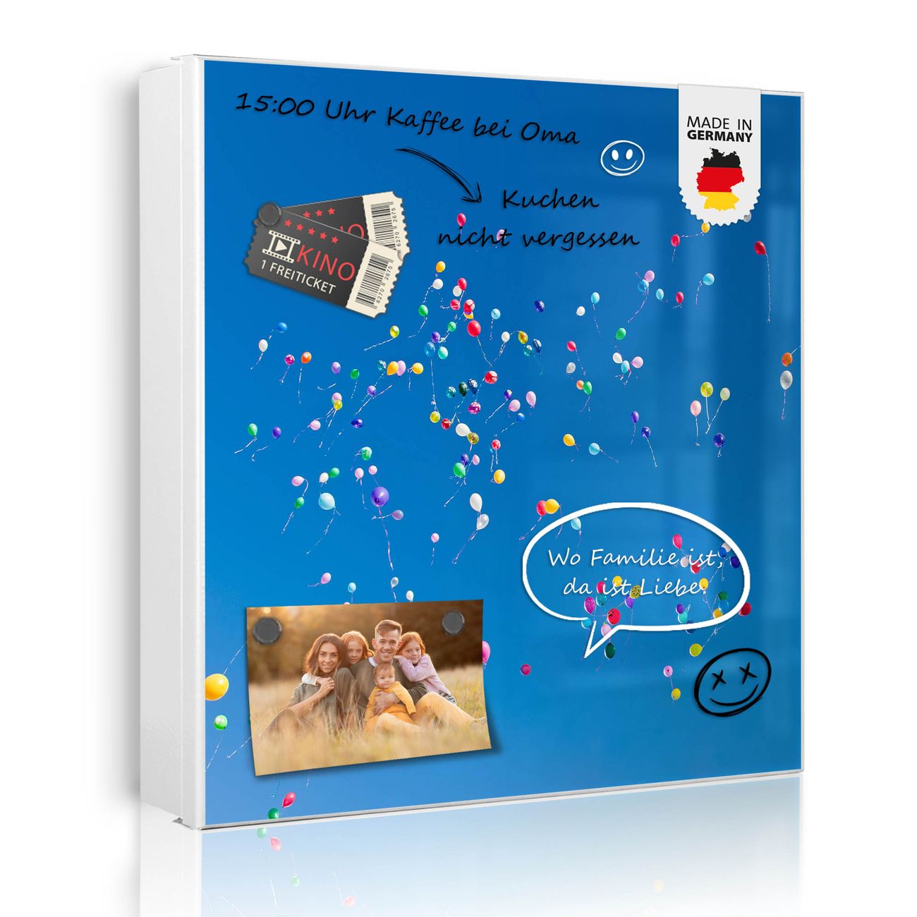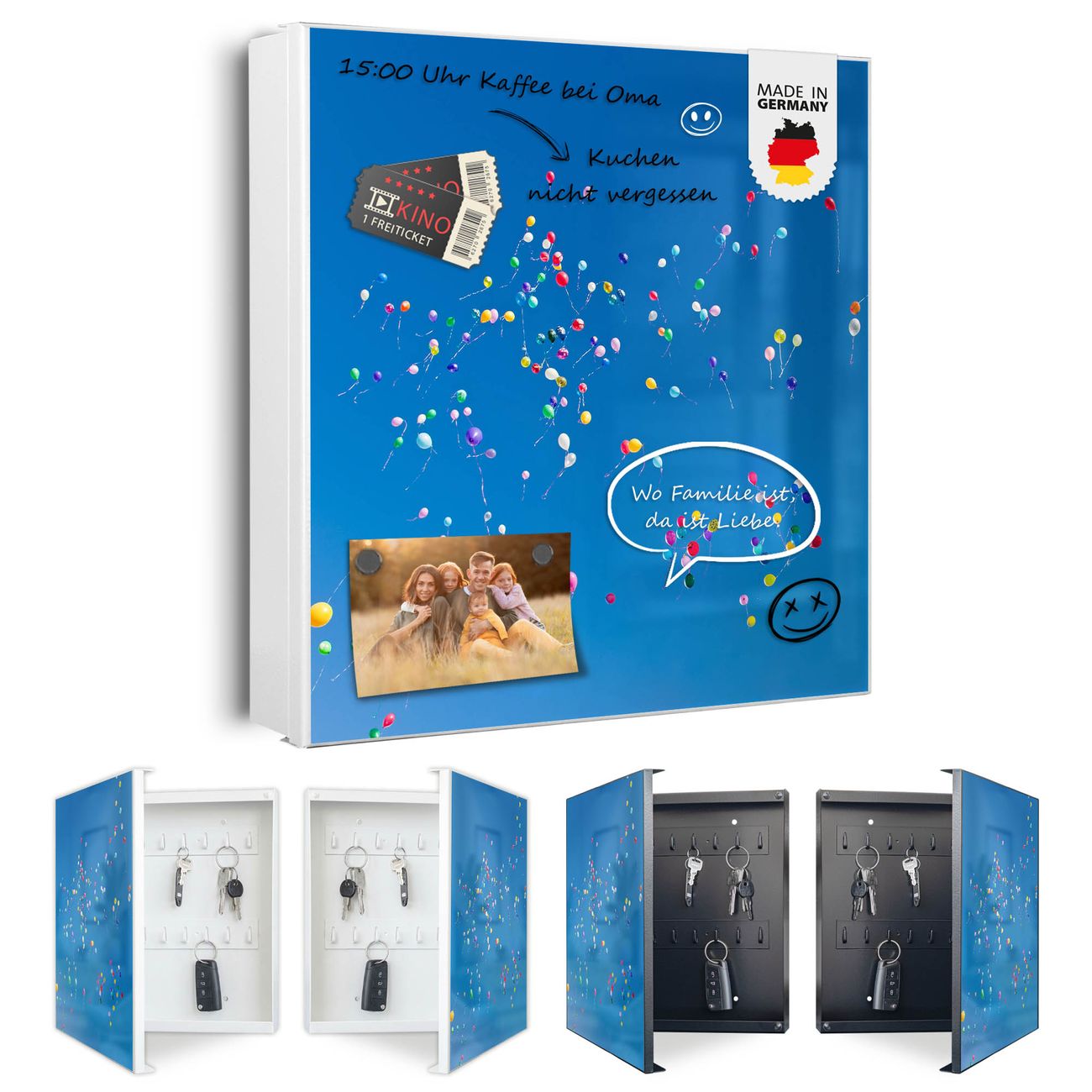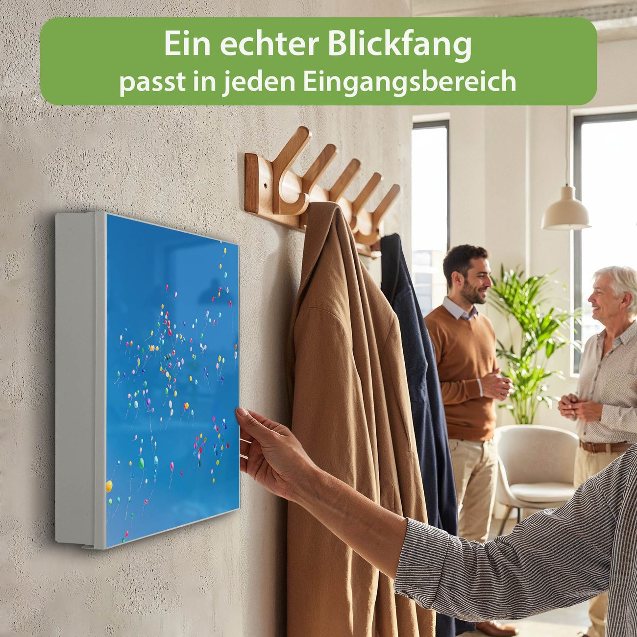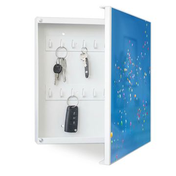Bringe Ordnung und Eleganz in deinen Eingangsbereich mit dem banjado Schlüsselkasten Motiv Motiv Bunte Luftballons. Die moderne Schlüsselbox kombiniert funktionales Design mit hochwertiger Verarbeitung und wird so zu einem echten Hingucker in Flur, Büro oder Ferienwohnung. ✅ Stilvolle Schlüsselaufbewahrung mit Motiv Motiv Bunte Luftballons Der Design-Schlüsselkasten Motiv Motiv Bunte Luftballons bietet Platz für bis zu 32 Schlüssel, die auf 4 stabilen Reihen mit je 8 Haken übersichtlich verstaut werden. Mit seinen kompakten Maßen von 30 x 30 x 5 cm passt die Schlüsselbox perfekt auch in kleinere Räume. Der weiß lackierte Stahlkorpus mit rechts angeschlagenem Türscharnier harmoniert mit gedruckten Folie auf der Front und fügt sich nahtlos in jedes Wohnambiente ein. Ob als Schlüsselorganizer für Zuhause oder als praktische Lösung für Büros, Praxen und Gewerbe, der banjado Schlüsselkasten sorgt für Ordnung und Übersicht. Dank der magnetischen, mit Kreidestiften beschreibbaren Folie auf der Front kannst du Notizen anheften oder Termine direkt auf der Oberfläche festhalten. Die Schlüsselbox Motiv Motiv Bunte Luftballons zur Wandmontage wird inklusive Befestigungsmaterial geliefert und ist schnell angebracht. So hast du deine Schlüssel jederzeit griffbereit und zugleich stilvoll verstaut. Mit diesem banjado Schlüsselkasten Motiv Motiv Bunte Luftballons kombinierst du praktische Aufbewahrung mit stilvollem Wohndesign. Ob privat oder geschäftlich, die Schlüsselbox sorgt für mehr Ordnung, Übersicht und ein wohnliches Ambiente.Vorteile im Überblick