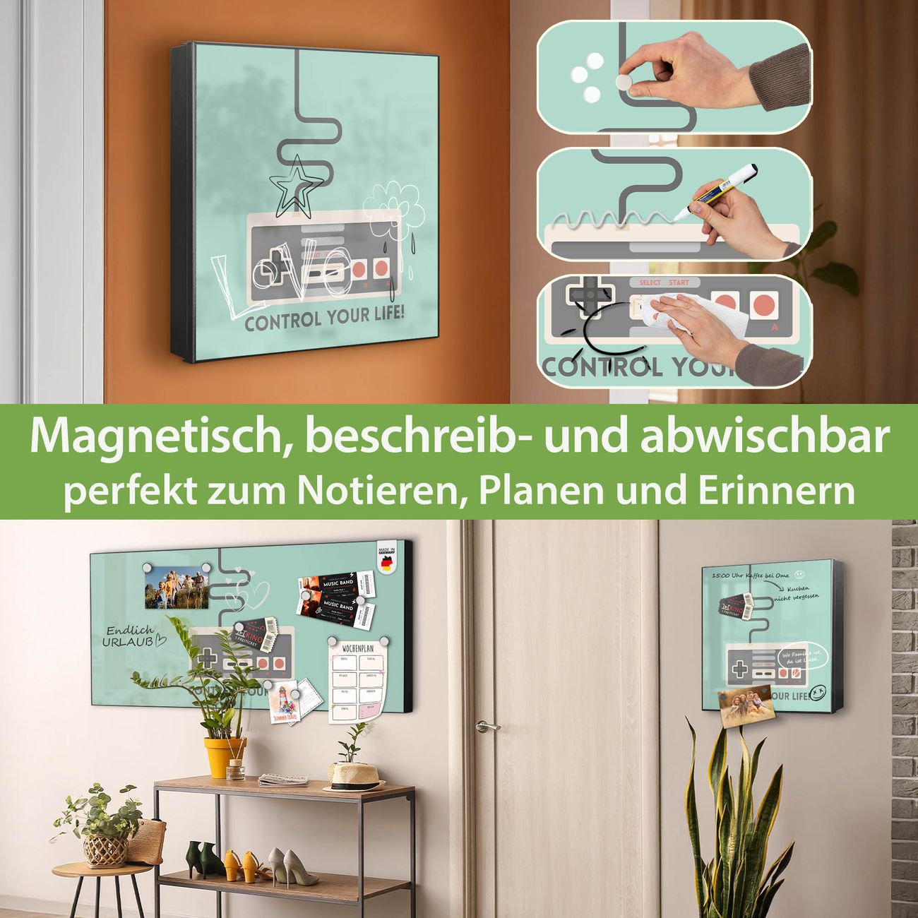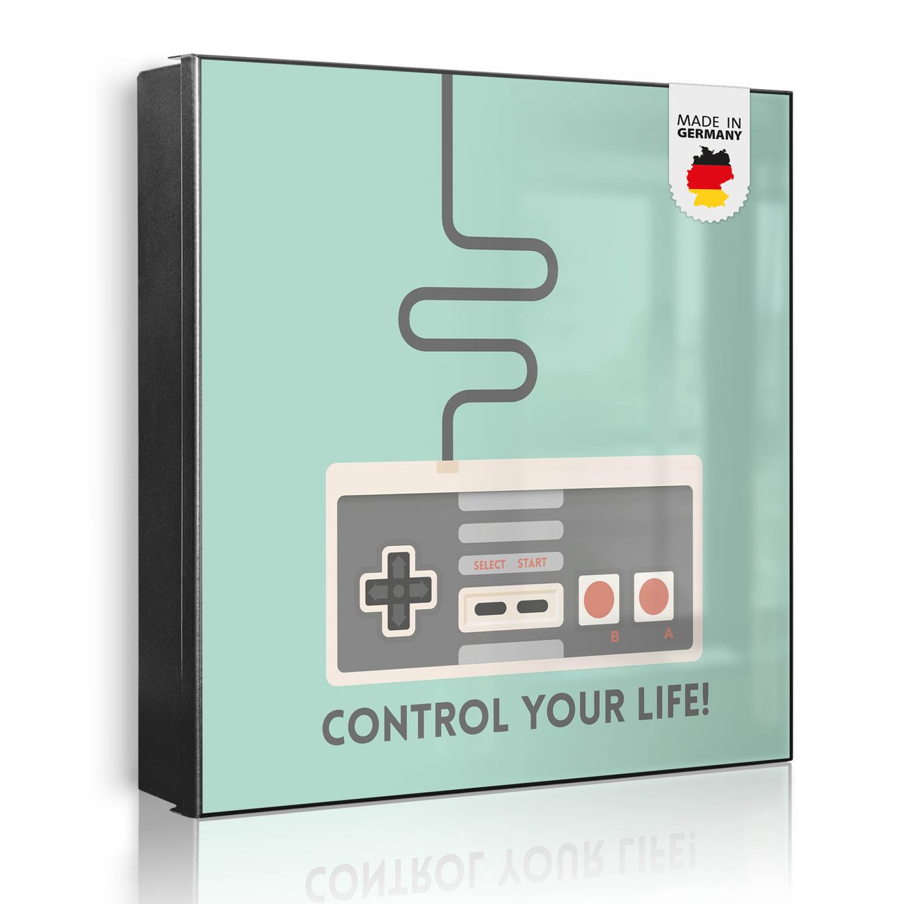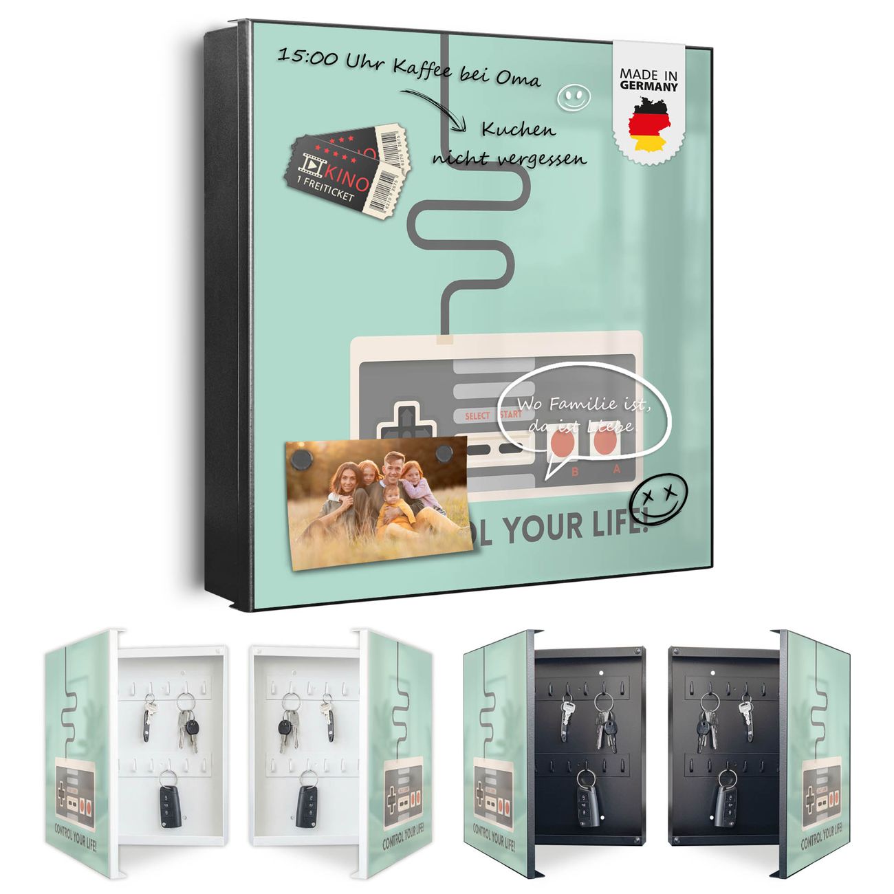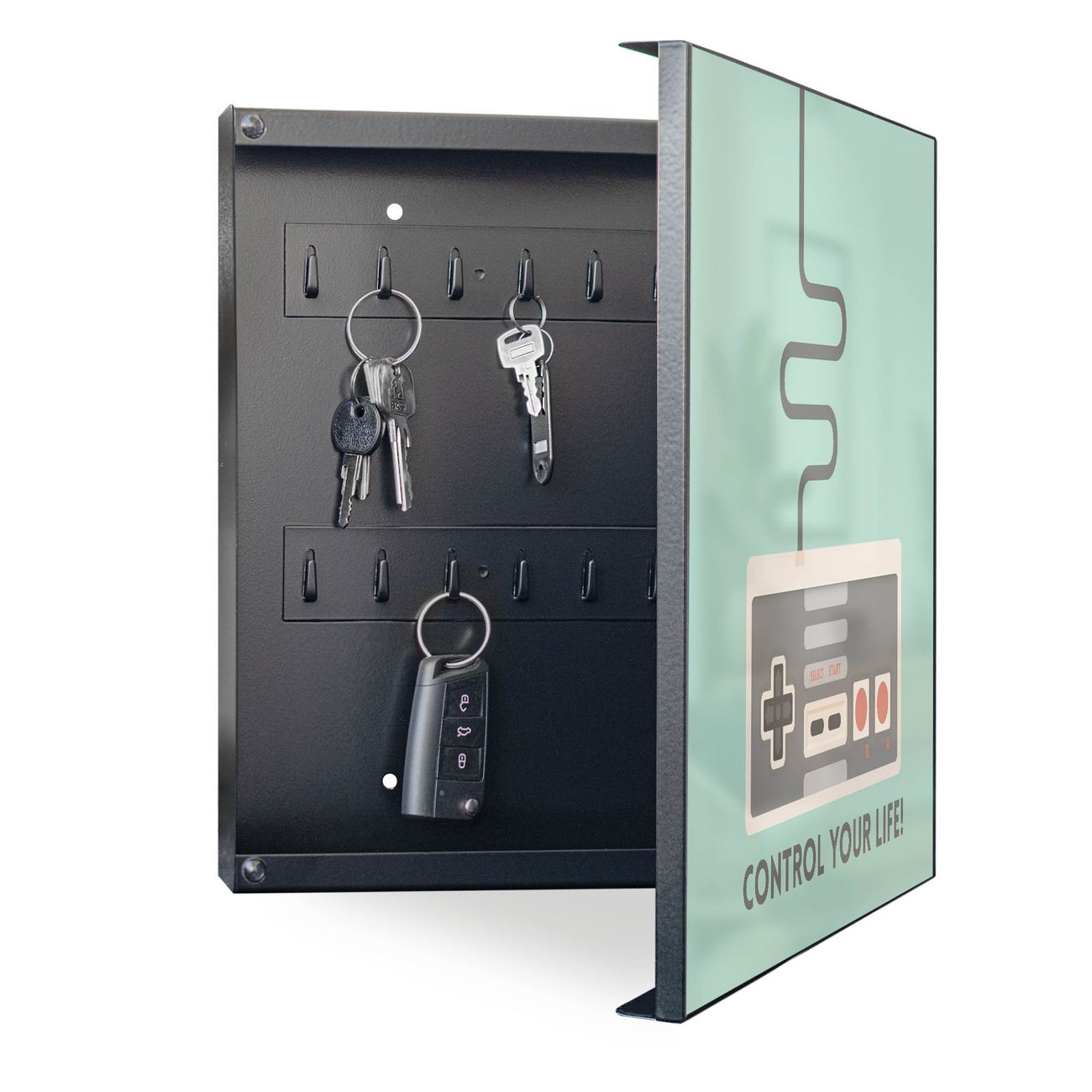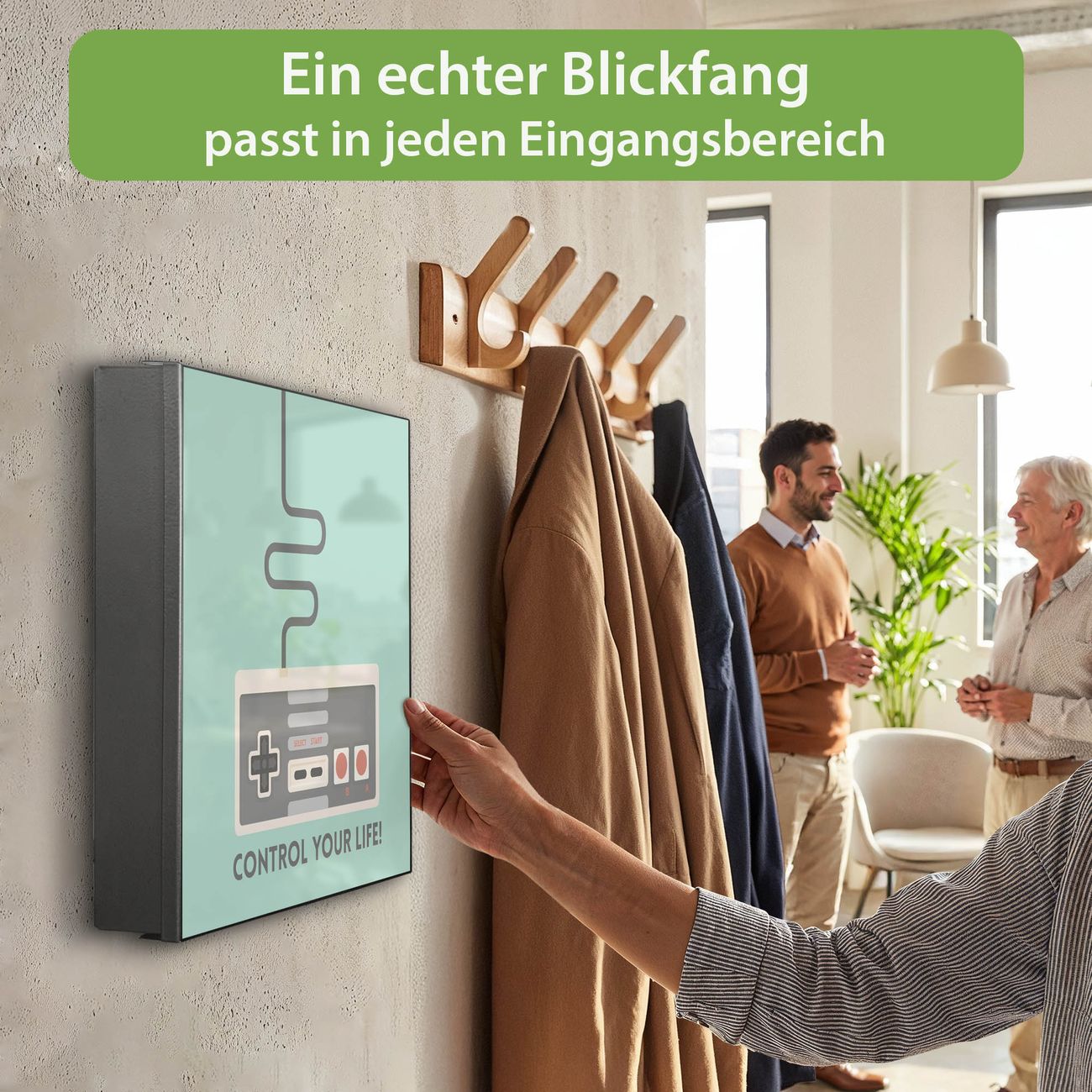 Bringe Ordnung und Eleganz in deinen Eingangsbereich mit dem banjado Schlüsselkasten Motiv Motiv Control. Die moderne Schlüsselbox kombiniert funktionales Design mit hochwertiger Verarbeitung und wird so zu einem echten Hingucker in Flur, Büro oder Ferienwohnung. ✅ Stilvolle Schlüsselaufbewahrung mit Motiv Motiv Control Der Design-Schlüsselkasten Motiv Motiv Control bietet Platz für bis zu 32 Schlüssel, die auf 4 stabilen Reihen mit je 8 Haken übersichtlich verstaut werden. Mit seinen kompakten Maßen von 30 x 30 x 5 cm passt die Schlüsselbox perfekt auch in kleinere Räume. Der schwarz lackierte Stahlkorpus mit rechts angeschlagenem Türscharnier harmoniert mit gedruckten Folie auf der Front und fügt sich nahtlos in jedes Wohnambiente ein. Ob als Schlüsselorganizer für Zuhause oder als praktische Lösung für Büros, Praxen und Gewerbe, der banjado Schlüsselkasten sorgt für Ordnung und Übersicht. Dank der magnetischen, mit Kreidestiften beschreibbaren Folie auf der Front kannst du Notizen anheften oder Termine direkt auf der Oberfläche festhalten. Die Schlüsselbox Motiv Motiv Control zur Wandmontage wird inklusive Befestigungsmaterial geliefert und ist schnell angebracht. So hast du deine Schlüssel jederzeit griffbereit und zugleich stilvoll verstaut. Mit diesem banjado Schlüsselkasten Motiv Motiv Control kombinierst du praktische Aufbewahrung mit stilvollem Wohndesign. Ob privat oder geschäftlich, die Schlüsselbox sorgt für mehr Ordnung, Übersicht und ein wohnliches Ambiente.Vorteile im Überblick