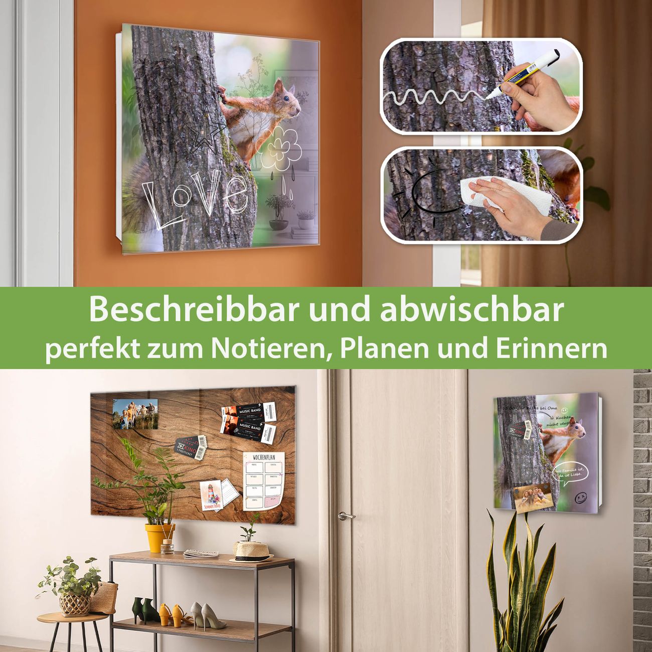 Bringe Ordnung und Eleganz in deinen Eingangsbereich mit dem banjado Schlüsselkasten Motiv Motiv Eichhörnchen. Die moderne Schlüsselbox kombiniert funktionales Design mit hochwertiger Verarbeitung und wird so zu einem echten Hingucker in Flur, Büro oder Ferienwohnung. ✅ Stilvolle Schlüsselaufbewahrung mit Glasfront im Motiv Motiv Eichhörnchen Der Design-Schlüsselkasten Motiv Motiv Eichhörnchen bietet Platz für bis zu 50 Schlüssel, die auf 5 stabilen Reihen mit je 10 Haken übersichtlich verstaut werden. Mit seinen kompakten Maßen von 30 x 30 x 5 cm passt die Schlüsselbox perfekt auch in kleinere Räume. Der weiß lackierte Stahlkorpus mit rechts angeschlagenem Türscharnier harmoniert mit der Glasfront und fügt sich nahtlos in jedes Wohnambiente ein. Ob als Schlüsselorganizer für Zuhause oder als praktische Lösung für Büros, Praxen und Gewerbe, der banjado Schlüsselkasten sorgt für Ordnung und Übersicht. Dank der magnetischen, mit Kreidestiften beschreibbaren Glasfront kannst du Notizen anheften oder Termine direkt auf der Oberfläche festhalten. Die Schlüsselbox Motiv Motiv Eichhörnchen zur Wandmontage wird inklusive Befestigungsmaterial geliefert und ist schnell angebracht. So hast du deine Schlüssel jederzeit griffbereit und zugleich stilvoll verstaut. Mit diesem banjado Schlüsselkasten Motiv Motiv Eichhörnchen kombinierst du praktische Aufbewahrung mit stilvollem Wohndesign. Ob privat oder geschäftlich, die Schlüsselbox sorgt für mehr Ordnung, Übersicht und ein wohnliches Ambiente.Vorteile im Überblick