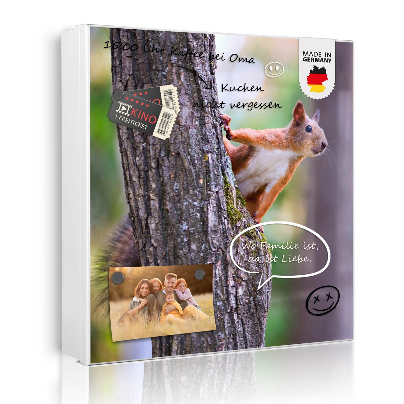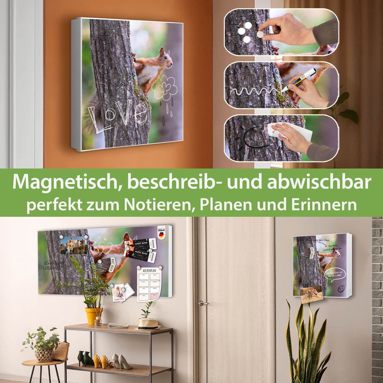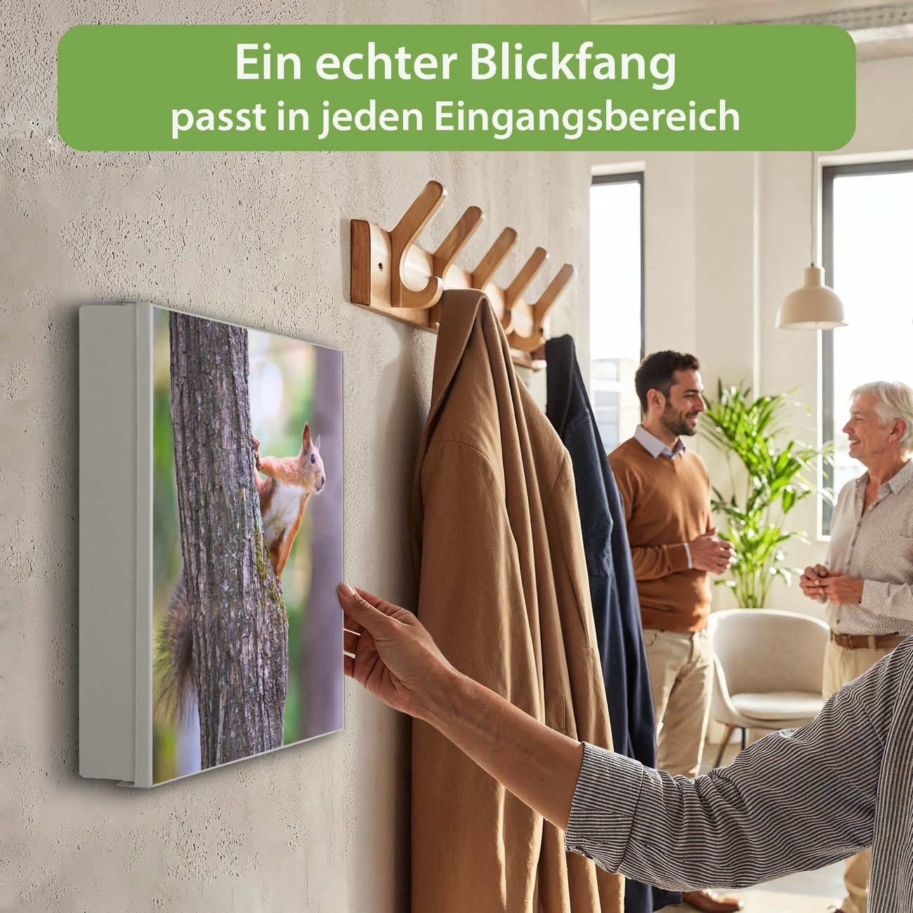 Bringe Ordnung und Eleganz in deinen Eingangsbereich mit dem banjado Schlüsselkasten Motiv Motiv Eichhörnchen. Die moderne Schlüsselbox kombiniert funktionales Design mit hochwertiger Verarbeitung und wird so zu einem echten Hingucker in Flur, Büro oder Ferienwohnung. ✅ Stilvolle Schlüsselaufbewahrung mit Motiv Motiv Eichhörnchen Der Design-Schlüsselkasten Motiv Motiv Eichhörnchen bietet Platz für bis zu 32 Schlüssel, die auf 4 stabilen Reihen mit je 8 Haken übersichtlich verstaut werden. Mit seinen kompakten Maßen von 30 x 30 x 5 cm passt die Schlüsselbox perfekt auch in kleinere Räume. Der weiß lackierte Stahlkorpus mit links angeschlagenem Türscharnier harmoniert mit gedruckten Folie auf der Front und fügt sich nahtlos in jedes Wohnambiente ein. Ob als Schlüsselorganizer für Zuhause oder als praktische Lösung für Büros, Praxen und Gewerbe, der banjado Schlüsselkasten sorgt für Ordnung und Übersicht. Dank der magnetischen, mit Kreidestiften beschreibbaren Folie auf der Front kannst du Notizen anheften oder Termine direkt auf der Oberfläche festhalten. Die Schlüsselbox Motiv Motiv Eichhörnchen zur Wandmontage wird inklusive Befestigungsmaterial geliefert und ist schnell angebracht. So hast du deine Schlüssel jederzeit griffbereit und zugleich stilvoll verstaut. Mit diesem banjado Schlüsselkasten Motiv Motiv Eichhörnchen kombinierst du praktische Aufbewahrung mit stilvollem Wohndesign. Ob privat oder geschäftlich, die Schlüsselbox sorgt für mehr Ordnung, Übersicht und ein wohnliches Ambiente.Vorteile im Überblick