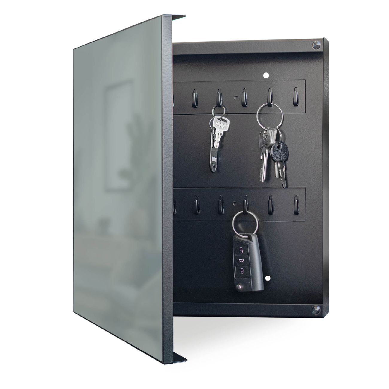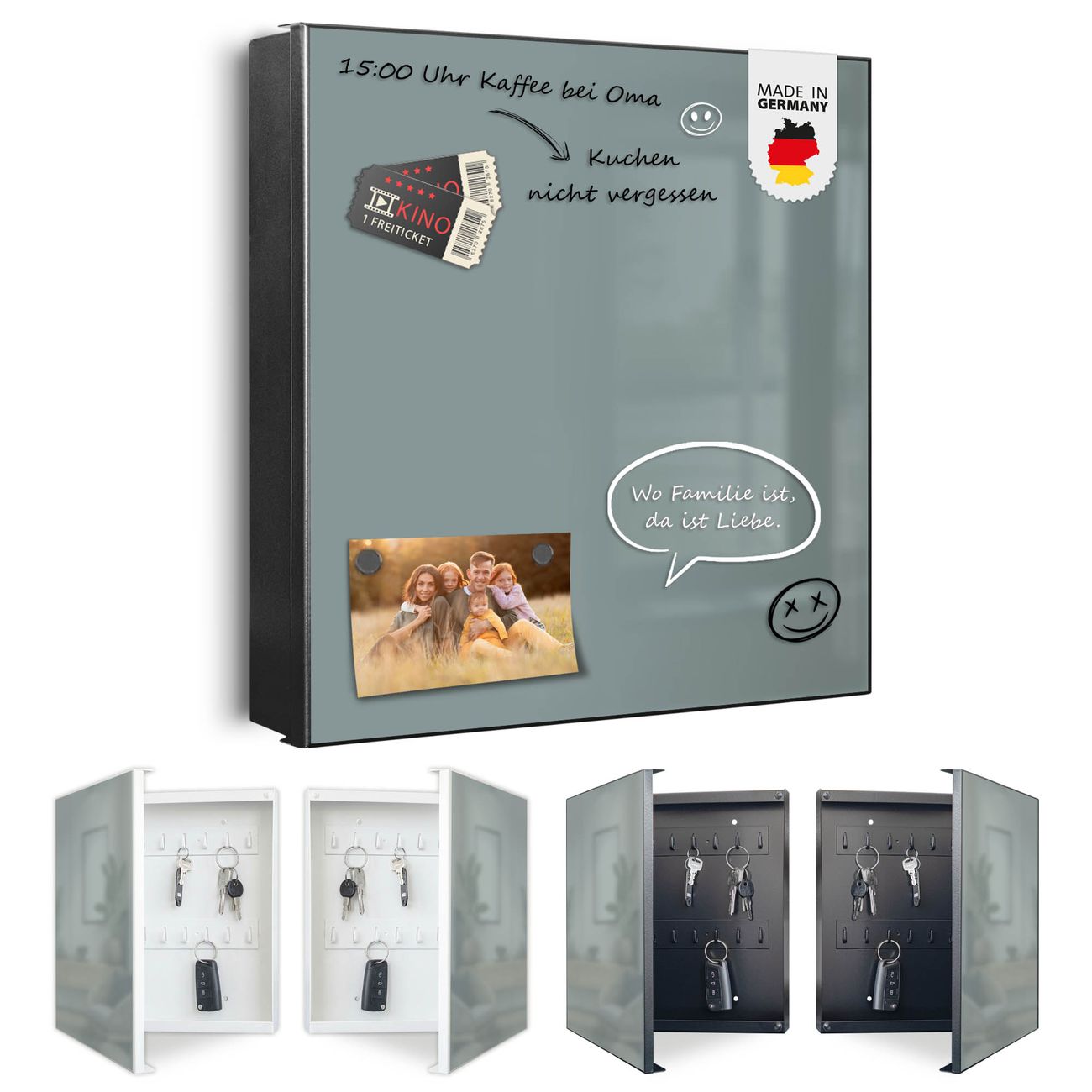 Bringe Ordnung und Eleganz in deinen Eingangsbereich mit dem banjado Schlüsselkasten Motiv Farbe Grau. Die moderne Schlüsselbox kombiniert funktionales Design mit hochwertiger Verarbeitung und wird so zu einem echten Hingucker in Flur, Büro oder Ferienwohnung. ✅ Stilvolle Schlüsselaufbewahrung mit Motiv Farbe Grau Der Design-Schlüsselkasten Motiv Farbe Grau bietet Platz für bis zu 32 Schlüssel, die auf 4 stabilen Reihen mit je 8 Haken übersichtlich verstaut werden. Mit seinen kompakten Maßen von 30 x 30 x 5 cm passt die Schlüsselbox perfekt auch in kleinere Räume. Der schwarz lackierte Stahlkorpus mit links angeschlagenem Türscharnier harmoniert mit gedruckten Folie auf der Front und fügt sich nahtlos in jedes Wohnambiente ein. Ob als Schlüsselorganizer für Zuhause oder als praktische Lösung für Büros, Praxen und Gewerbe, der banjado Schlüsselkasten sorgt für Ordnung und Übersicht. Dank der magnetischen, mit Kreidestiften beschreibbaren Folie auf der Front kannst du Notizen anheften oder Termine direkt auf der Oberfläche festhalten. Die Schlüsselbox Motiv Farbe Grau zur Wandmontage wird inklusive Befestigungsmaterial geliefert und ist schnell angebracht. So hast du deine Schlüssel jederzeit griffbereit und zugleich stilvoll verstaut. Mit diesem banjado Schlüsselkasten Motiv Farbe Grau kombinierst du praktische Aufbewahrung mit stilvollem Wohndesign. Ob privat oder geschäftlich, die Schlüsselbox sorgt für mehr Ordnung, Übersicht und ein wohnliches Ambiente.Vorteile im Überblick