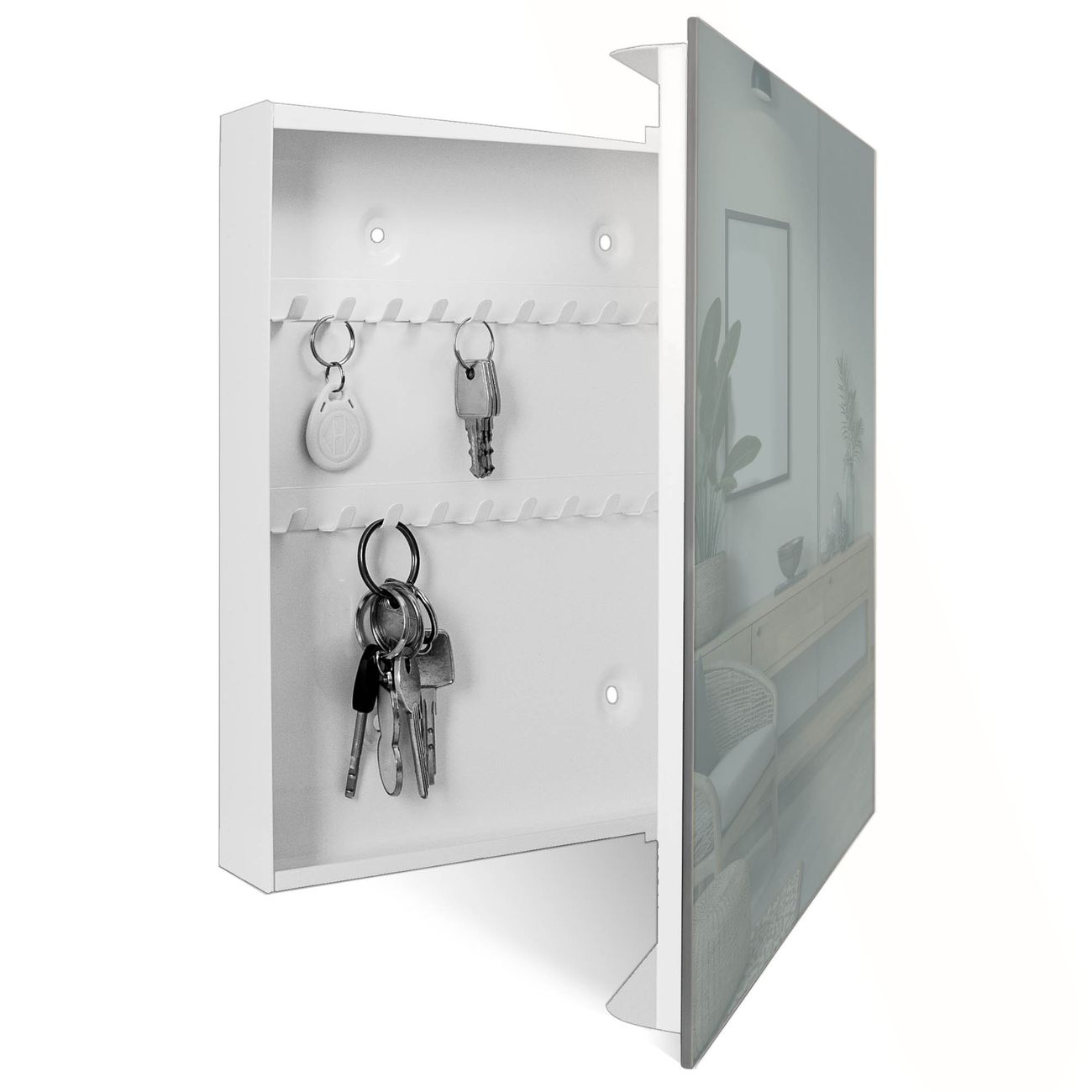 Bringe Ordnung und Eleganz in deinen Eingangsbereich mit dem banjado Schlüsselkasten Motiv Farbe Grau. Die moderne Schlüsselbox kombiniert funktionales Design mit hochwertiger Verarbeitung und wird so zu einem echten Hingucker in Flur, Büro oder Ferienwohnung. ✅ Stilvolle Schlüsselaufbewahrung mit Glasfront im Motiv Farbe Grau Der Design-Schlüsselkasten Motiv Farbe Grau bietet Platz für bis zu 50 Schlüssel, die auf 5 stabilen Reihen mit je 10 Haken übersichtlich verstaut werden. Mit seinen kompakten Maßen von 30 x 30 x 5 cm passt die Schlüsselbox perfekt auch in kleinere Räume. Der weiß lackierte Stahlkorpus mit rechts angeschlagenem Türscharnier harmoniert mit der Glasfront und fügt sich nahtlos in jedes Wohnambiente ein. Ob als Schlüsselorganizer für Zuhause oder als praktische Lösung für Büros, Praxen und Gewerbe, der banjado Schlüsselkasten sorgt für Ordnung und Übersicht. Dank der magnetischen, mit Kreidestiften beschreibbaren Glasfront kannst du Notizen anheften oder Termine direkt auf der Oberfläche festhalten. Die Schlüsselbox Motiv Farbe Grau zur Wandmontage wird inklusive Befestigungsmaterial geliefert und ist schnell angebracht. So hast du deine Schlüssel jederzeit griffbereit und zugleich stilvoll verstaut. Mit diesem banjado Schlüsselkasten Motiv Farbe Grau kombinierst du praktische Aufbewahrung mit stilvollem Wohndesign. Ob privat oder geschäftlich, die Schlüsselbox sorgt für mehr Ordnung, Übersicht und ein wohnliches Ambiente.Vorteile im Überblick