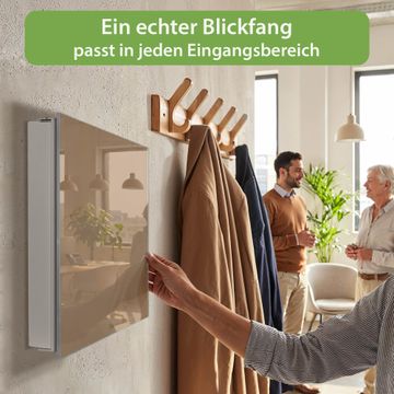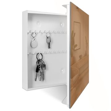 Bringe Ordnung und Eleganz in deinen Eingangsbereich mit dem banjado Schlüsselkasten Motiv Farbe Kupfer Metallic. Die moderne Schlüsselbox kombiniert funktionales Design mit hochwertiger Verarbeitung und wird so zu einem echten Hingucker in Flur, Büro oder Ferienwohnung. ✅ Stilvolle Schlüsselaufbewahrung mit Glasfront im Motiv Farbe Kupfer Metallic Der Design-Schlüsselkasten Motiv Farbe Kupfer Metallic bietet Platz für bis zu 50 Schlüssel, die auf 5 stabilen Reihen mit je 10 Haken übersichtlich verstaut werden. Mit seinen kompakten Maßen von 30 x 30 x 5 cm passt die Schlüsselbox perfekt auch in kleinere Räume. Der weiß lackierte Stahlkorpus mit rechts angeschlagenem Türscharnier harmoniert mit der Glasfront und fügt sich nahtlos in jedes Wohnambiente ein. Ob als Schlüsselorganizer für Zuhause oder als praktische Lösung für Büros, Praxen und Gewerbe, der banjado Schlüsselkasten sorgt für Ordnung und Übersicht. Dank der magnetischen, mit Kreidestiften beschreibbaren Glasfront kannst du Notizen anheften oder Termine direkt auf der Oberfläche festhalten. Die Schlüsselbox Motiv Farbe Kupfer Metallic zur Wandmontage wird inklusive Befestigungsmaterial geliefert und ist schnell angebracht. So hast du deine Schlüssel jederzeit griffbereit und zugleich stilvoll verstaut. Mit diesem banjado Schlüsselkasten Motiv Farbe Kupfer Metallic kombinierst du praktische Aufbewahrung mit stilvollem Wohndesign. Ob privat oder geschäftlich, die Schlüsselbox sorgt für mehr Ordnung, Übersicht und ein wohnliches Ambiente.Vorteile im Überblick